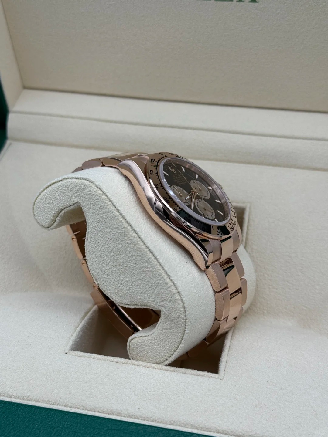 The Oyster Perpetual Cosmograph Daytona in 18 ct Everose gold features a glossy black and sunrise gold dial and an Oyster bracelet with an engraved tachymeter on an 18-carat Everose gold bezel. -m126505-0001 40mm