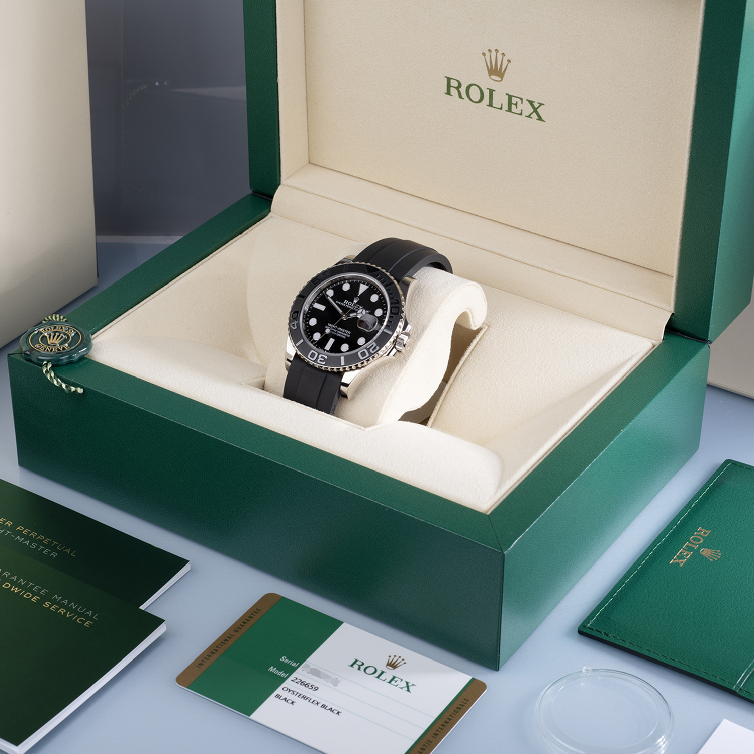 The most desirable Yacht-Master Rolex ever made. A fully fledged sports watch (waterproof to 100m), yet elegant and discreet enough for the boardroom, this precious metal Yacht-Master ref. 226659 is fitted to the super comfy black Oysterflex strap. Sporting a matt finished bi-directional Cerachrom bezel (developed by Rolex to be scratch & fade resistant ) and a highly legible black dial with Chromalight hands & markers. Powered by Rolex's updated self-winding calibre 3235, now with a generous 70-hour power–reserve. Waterproof to 100m.