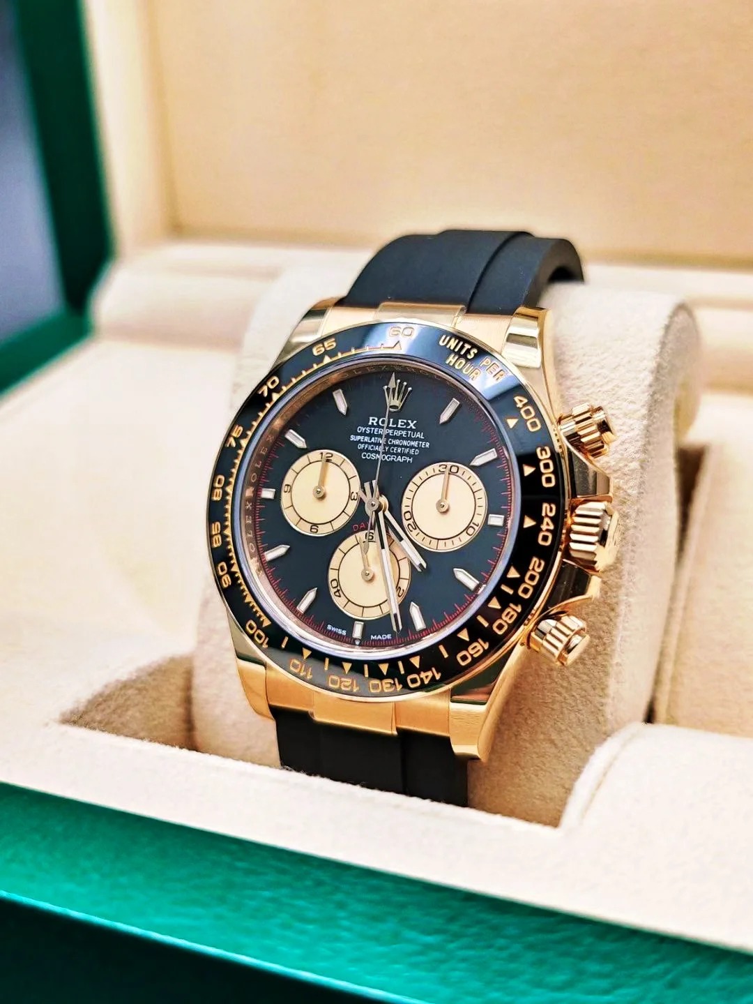 The Oyster Perpetual Cosmograph Daytona in 18 ct yellow gold with a mellow black and champagne dial and an Oysterflex strap with a black Cerachrom bezel with tachymeter. -m126518ln-0004 40mm