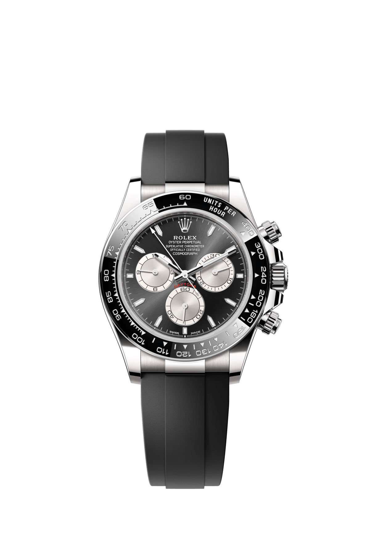 The Oyster Perpetual Cosmograph Daytona in 18K white gold features a stainless steel and gloss black dial and an Oysterflex bracelet with a black Cerachrom bezel with a tachymeter. -m126519ln-0006 40mm