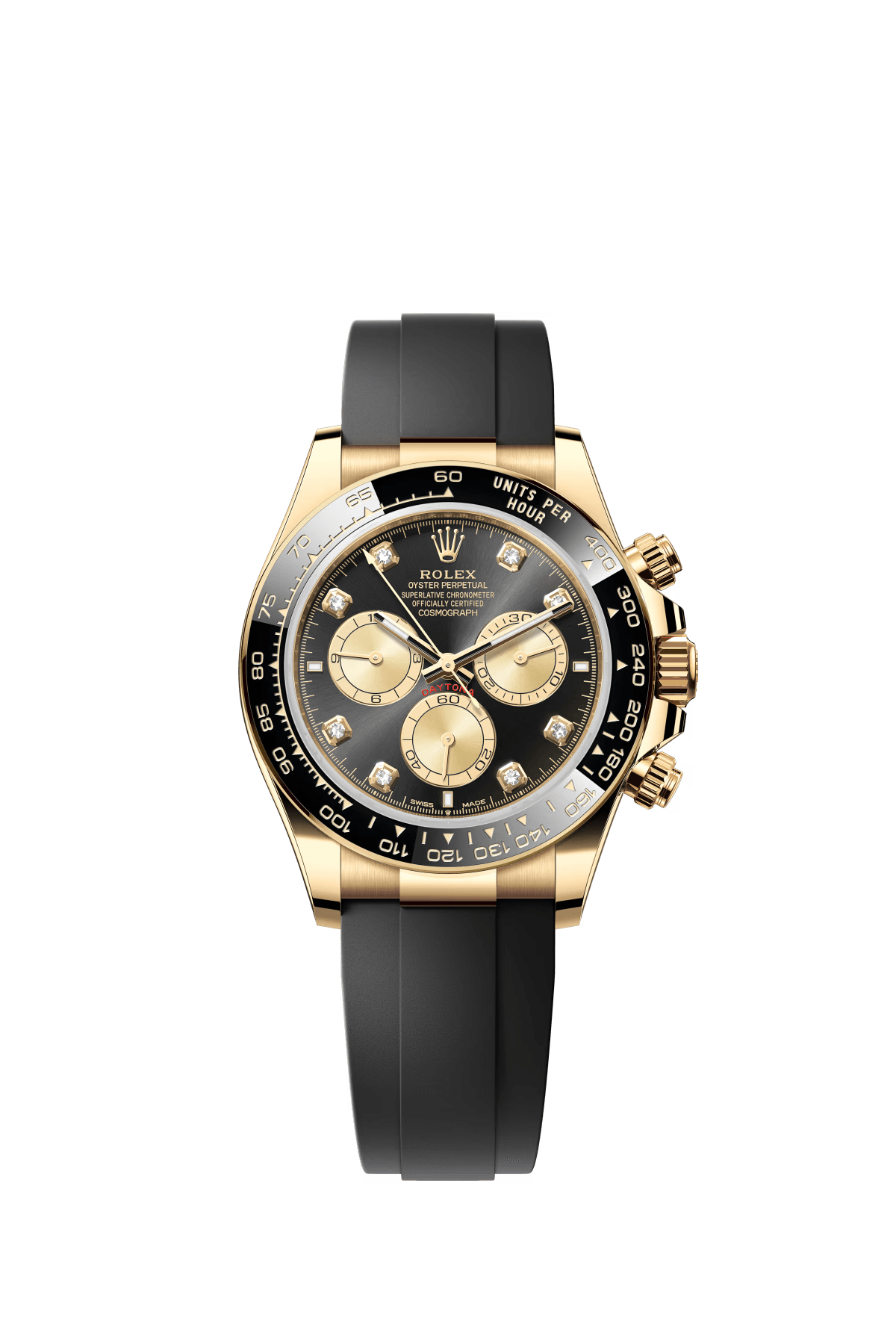 The Oyster Perpetual Cosmograph Daytona in 18K yellow gold features a shiny black and gold diamond-set dial and an Oysterflex bracelet with a black Cerachrom bezel with a tachymeter. -m126518ln-0006 40mm