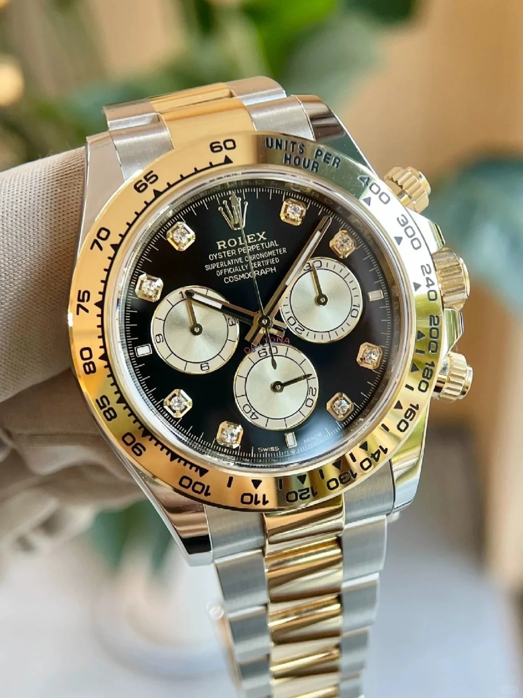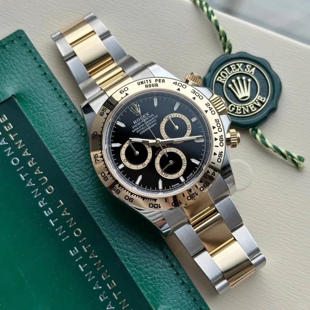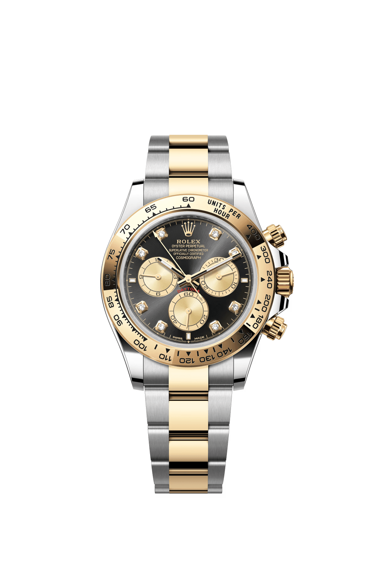 The Oyster Perpetual Cosmograph Daytona in yellow gold and Oystersteel features a diamond-set shiny black and gold dial and an Oyster bracelet with a tachymeter engraved on a yellow gold bezel. -m126503-0002 40mm