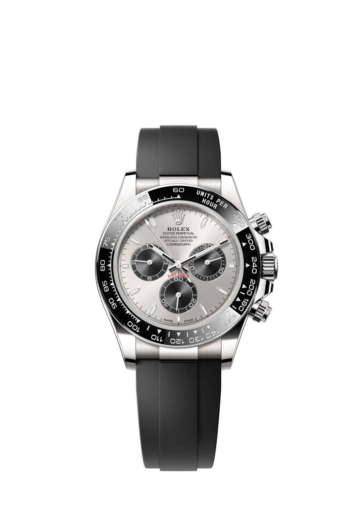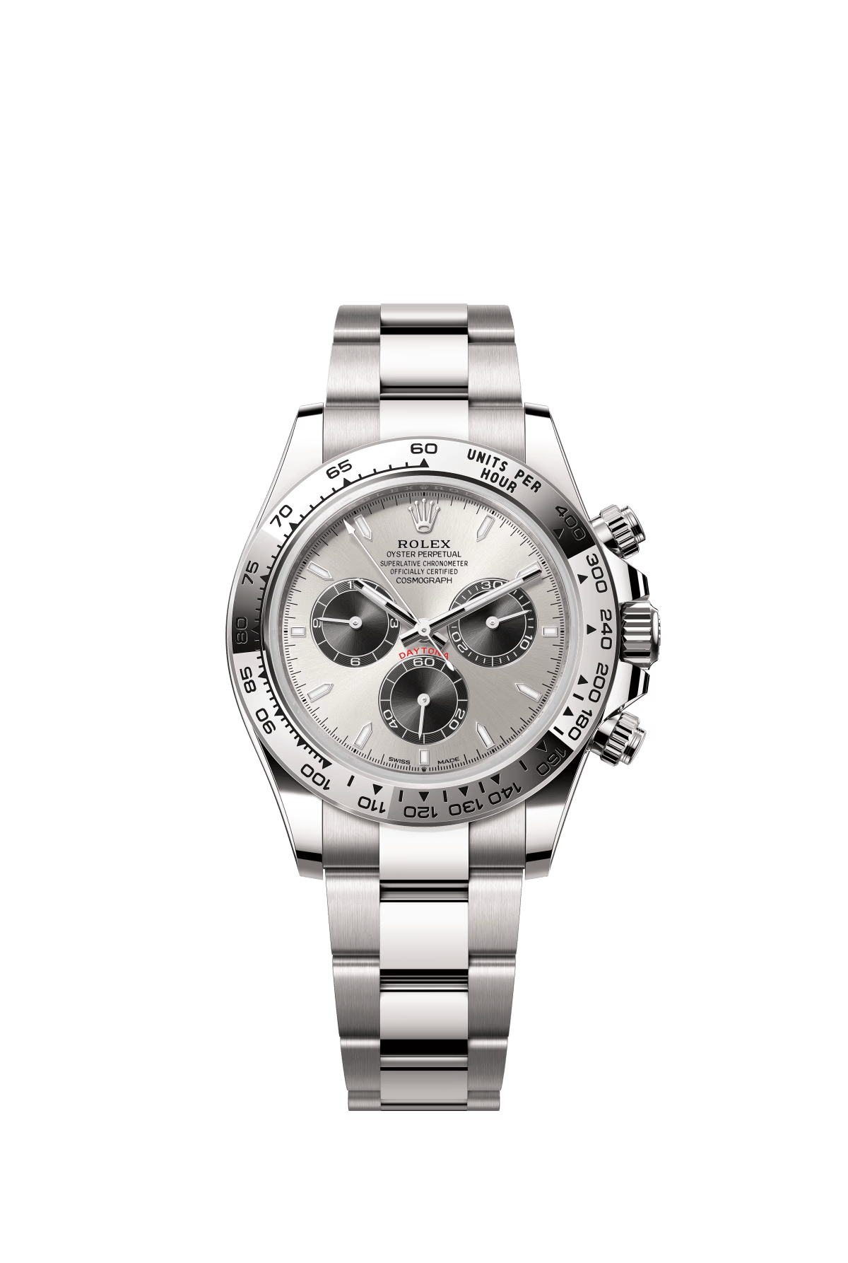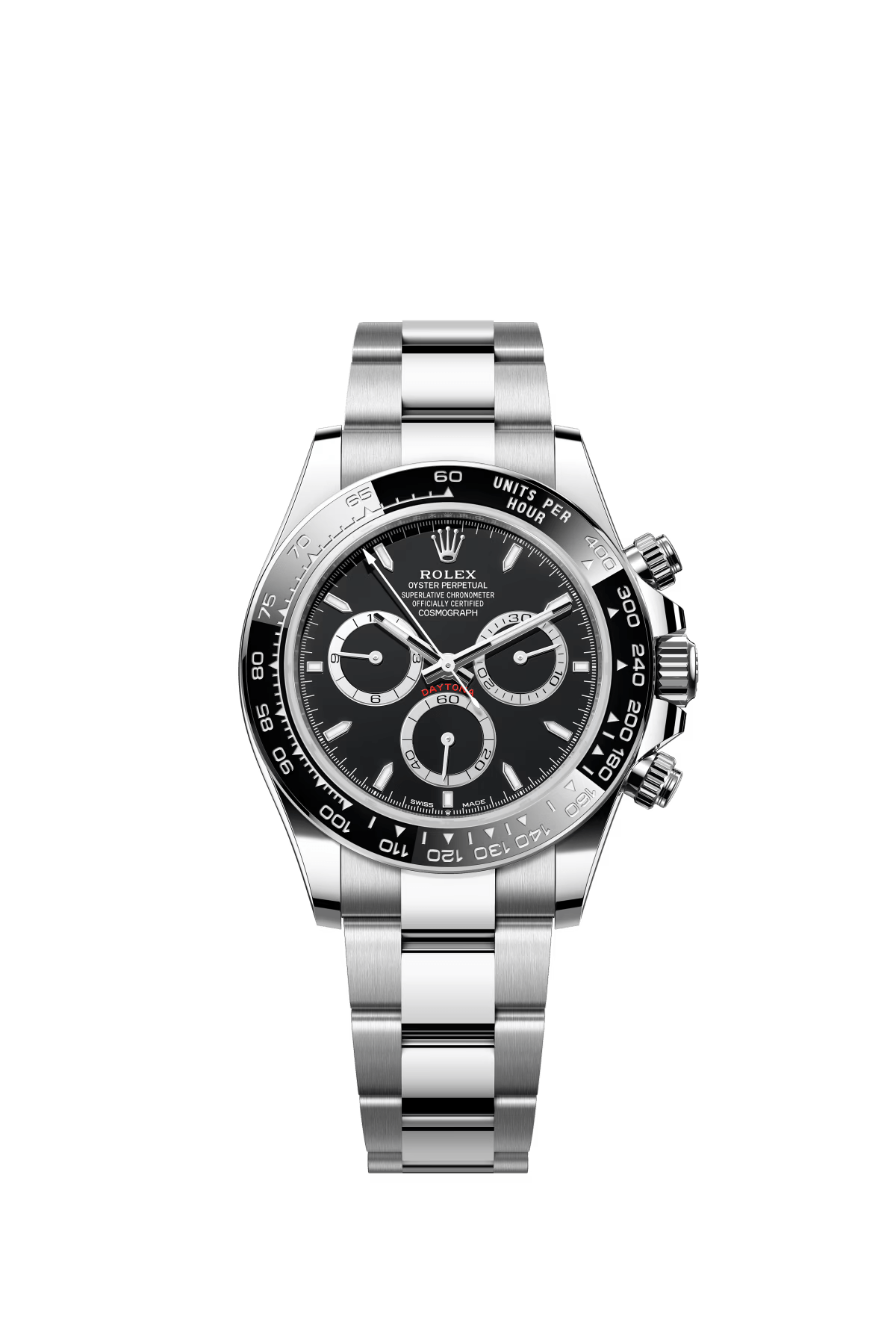 The Oyster Perpetual Cosmograph Daytona is made of Oyster steel with a white dial and contrasting counters. The watch is fitted with an Oyster bracelet and a black Cerachrom bezel with tachymeter. -m126500ln-0001 40mm