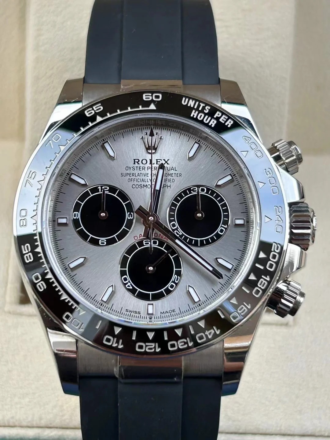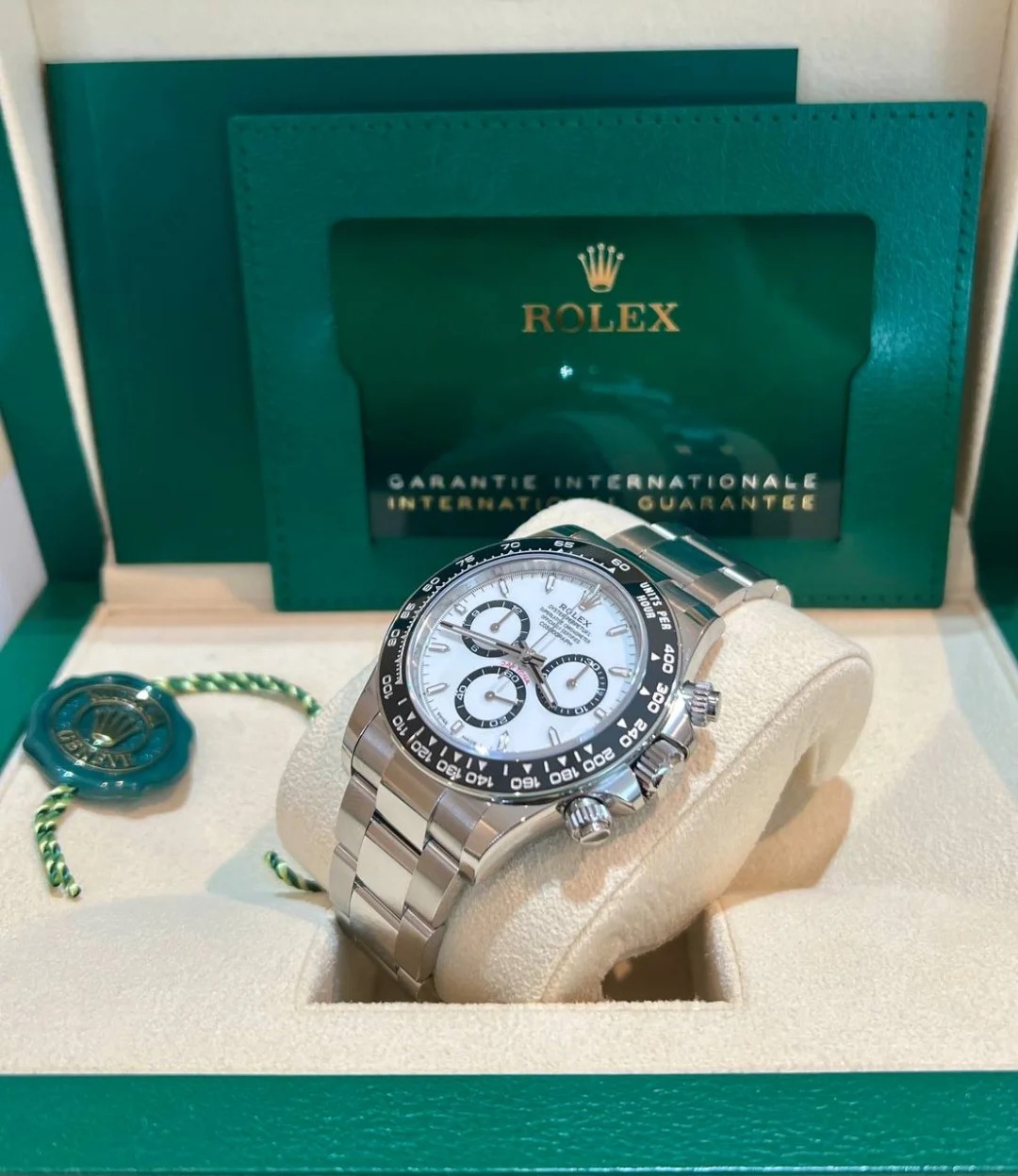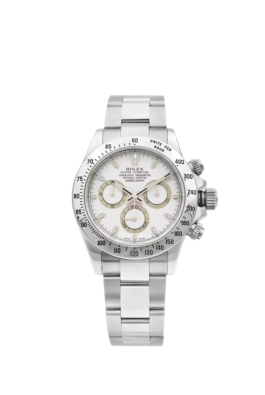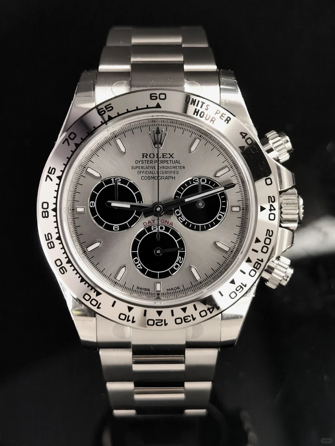 The Oyster Perpetual Cosmograph Daytona is made of Oyster steel with a white dial and contrasting counters. The watch is fitted with an Oyster bracelet and a black Cerachrom bezel with tachymeter. -m126500ln-0001 40mm