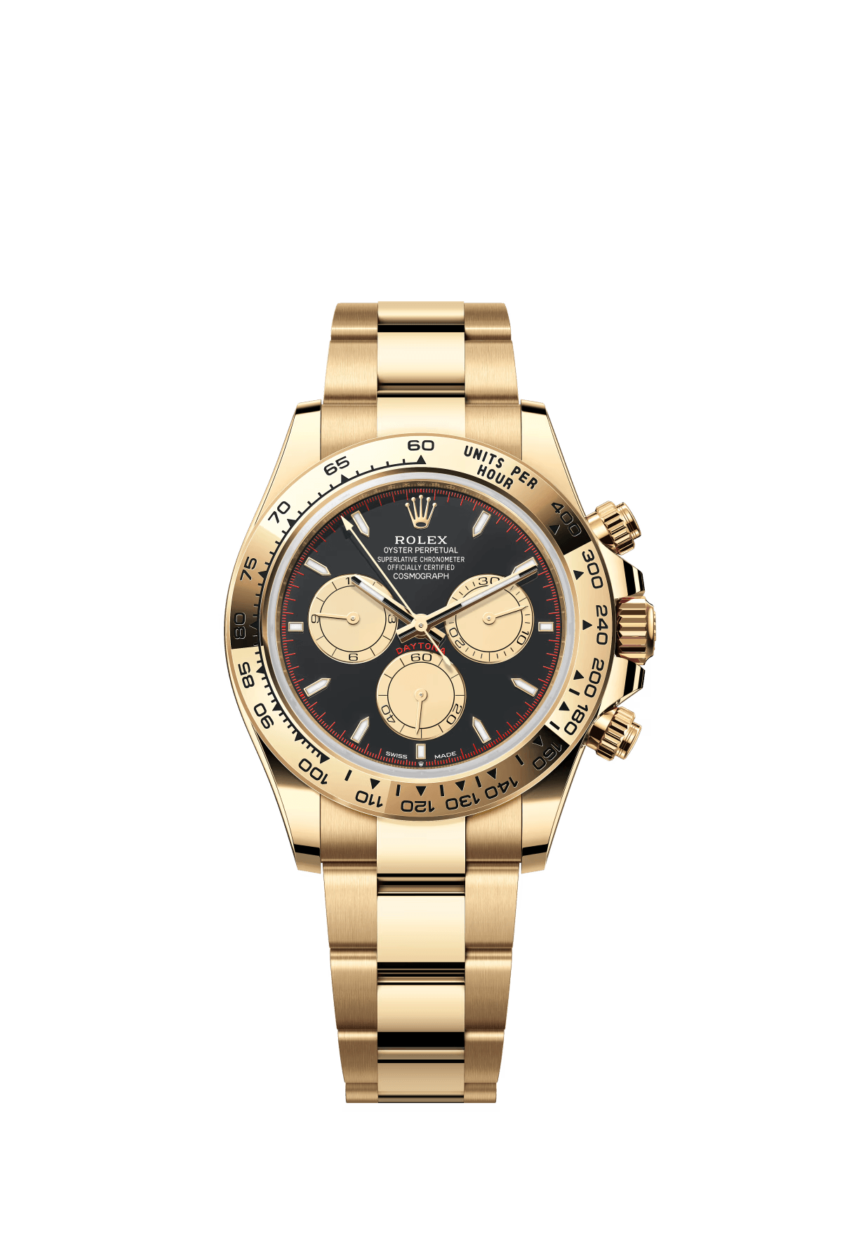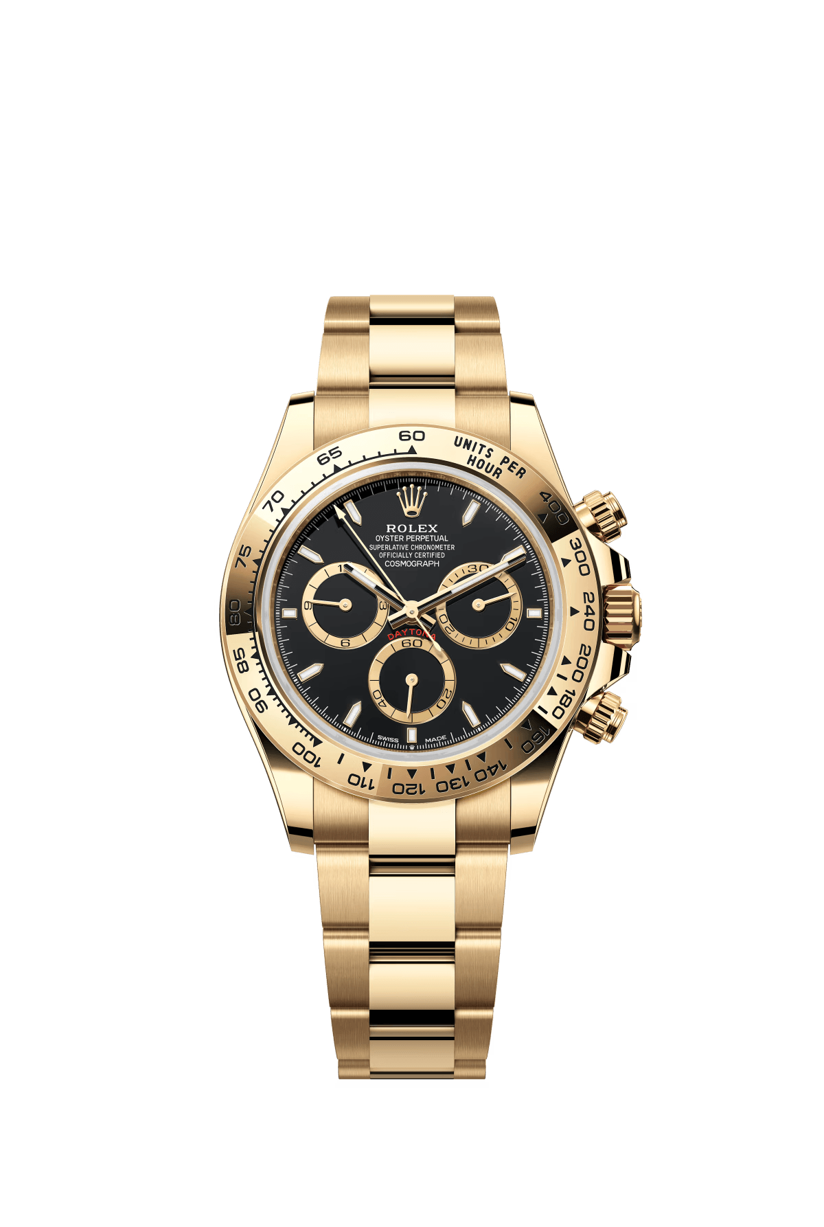 The Oyster Perpetual Cosmograph Daytona is available in 18 ct yellow gold with a black dial and contrasting counters. The watch is fitted with an Oyster bracelet and an 18-carat yellow gold bezel engraved with a tachymeter. -m126508-0004 40mm