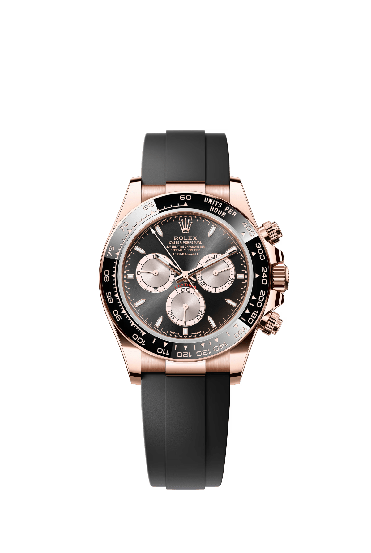 The Oyster Perpetual Cosmograph Daytona in 18 ct Everose gold features a glossy black and sunrise gold dial and an Oysterflex strap with a black Cerachrom bezel with tachymeter. -m126515ln-0002 40mm