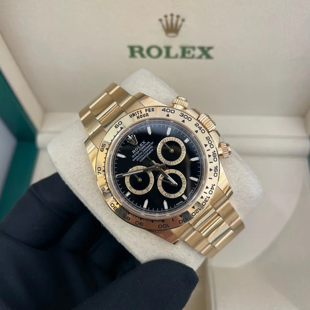 The Oyster Perpetual Cosmograph Daytona in 18 ct yellow gold features a shiny black and gold diamond-set dial and an Oyster bracelet with an engraved tachymeter on the 18-carat yellow gold bezel. -m126508-0003 40mm