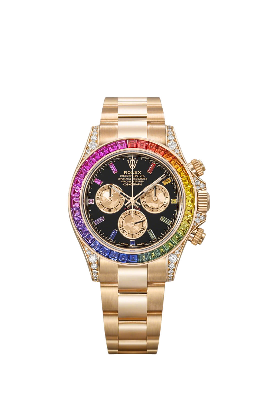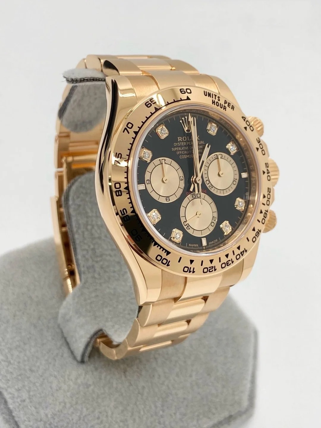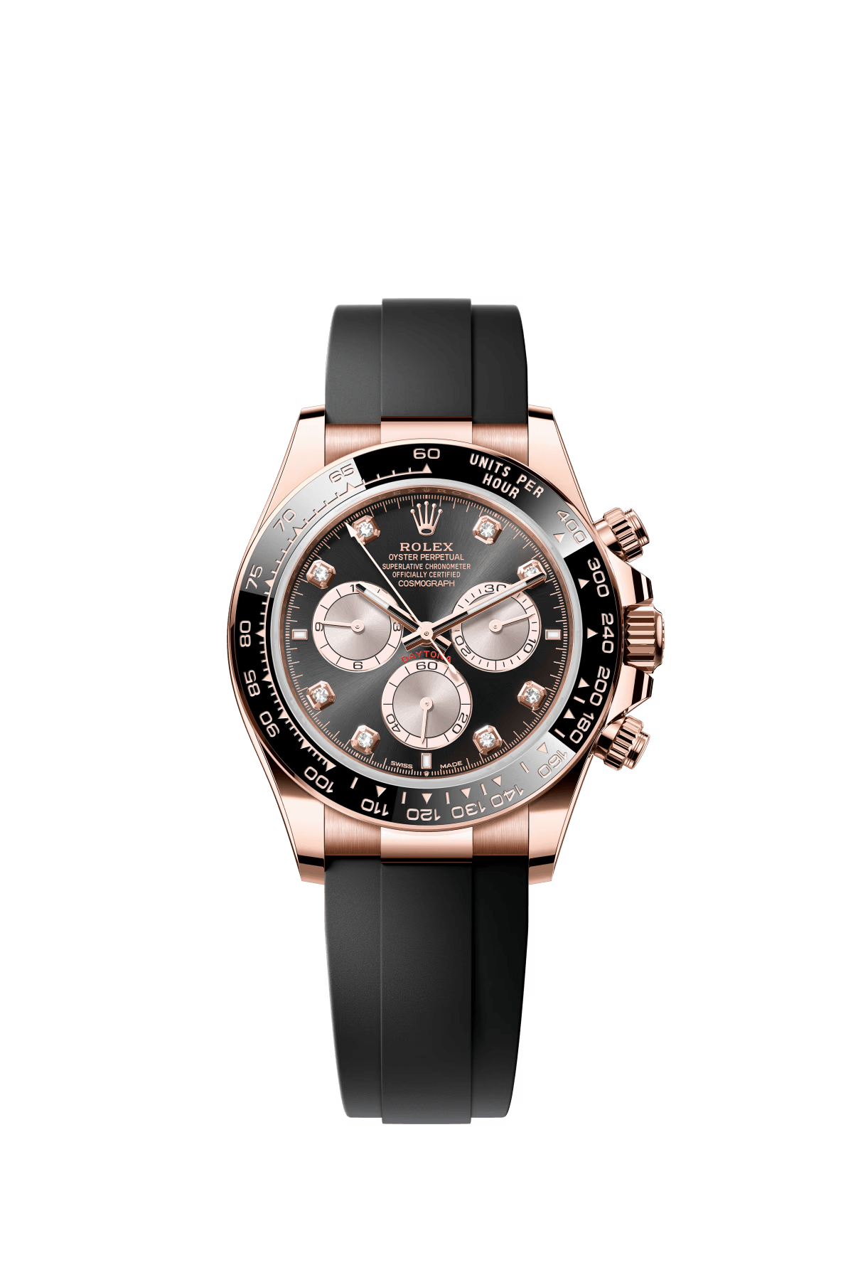 The Oyster Perpetual Cosmograph Daytona in 18 ct Everose gold features a diamond-set gloss black and sunrise gold dial and an Oyster bracelet with an engraved tachymeter on an 18-carat Everose gold bezel. -m126505-0002 40mm