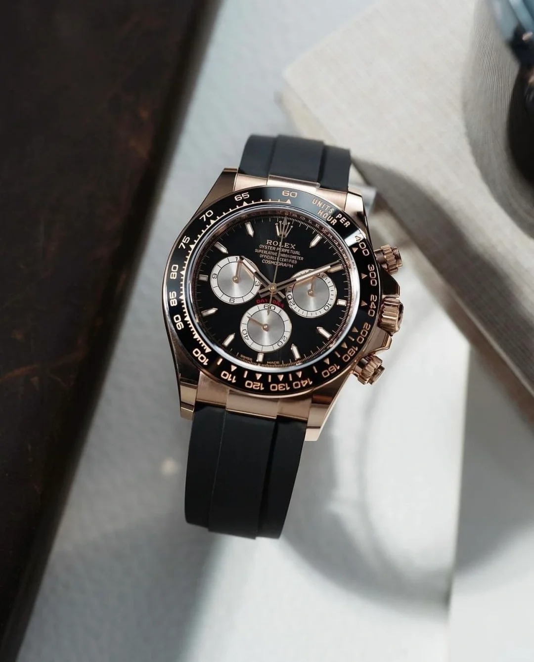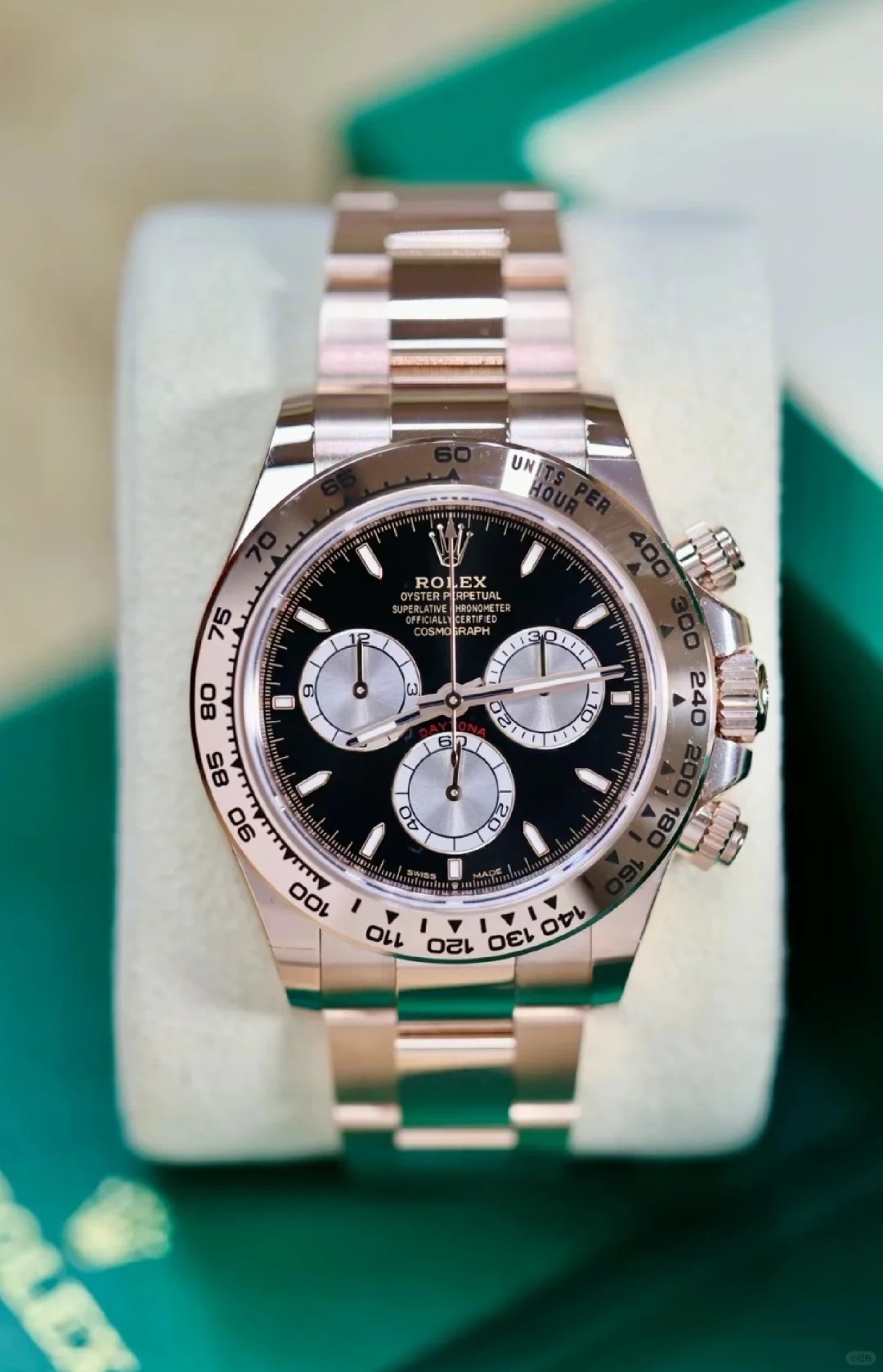 The Oyster Perpetual Cosmograph Daytona in 18 ct Everose gold features a glossy black and sunrise gold dial and an Oyster bracelet with an engraved tachymeter on an 18-carat Everose gold bezel. -m126505-0001 40mm