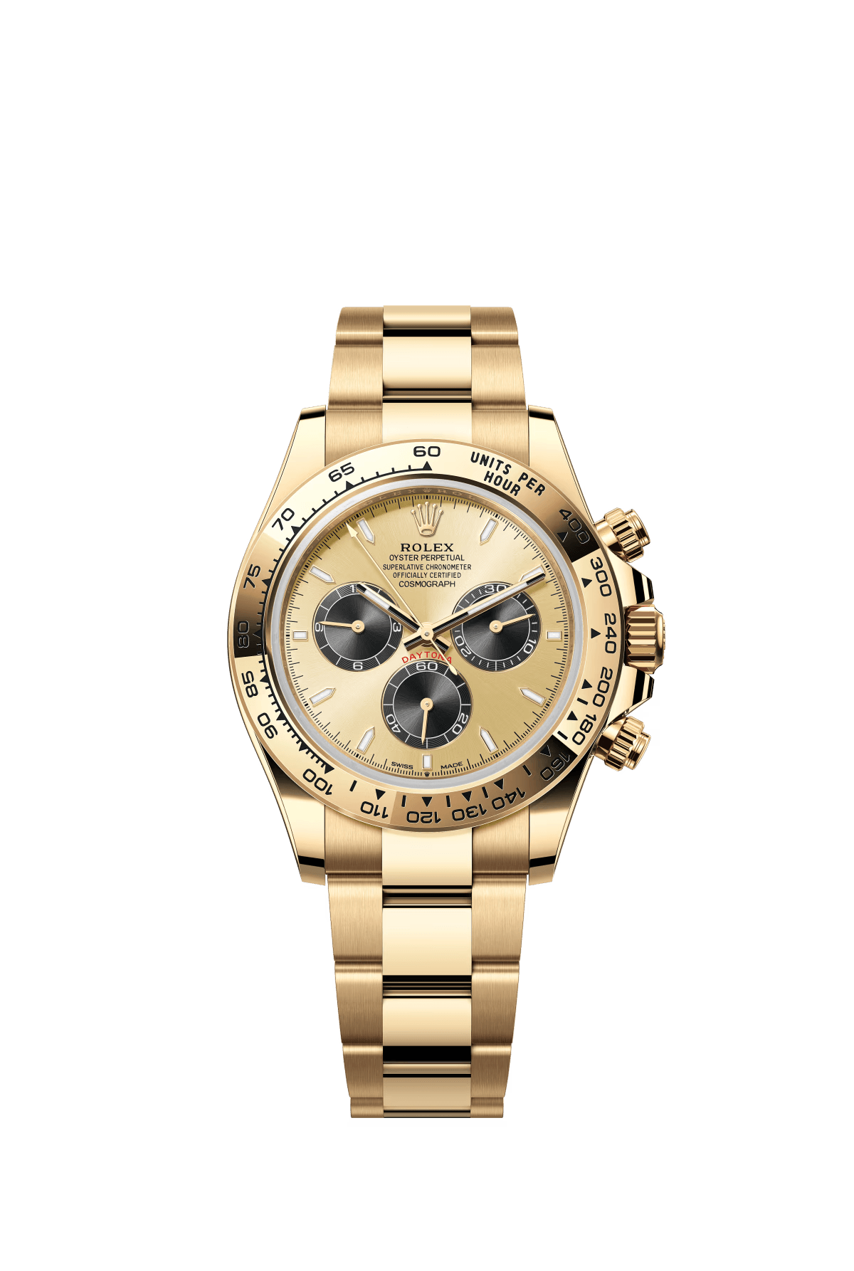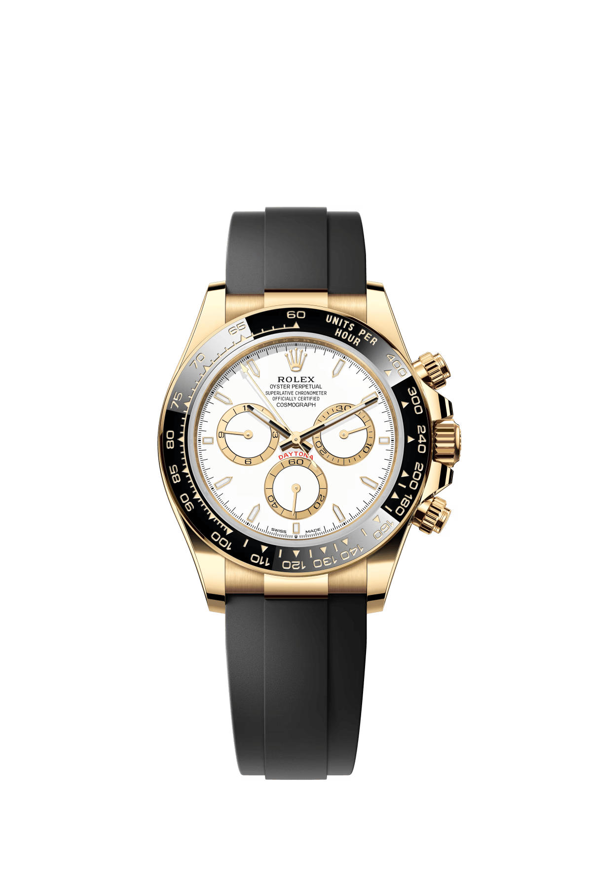 The Oyster Perpetual Cosmograph Daytona in 18 ct yellow gold with a white dial and contrasting counters. The watch is fitted with an Oyster bracelet and an 18-carat yellow gold bezel engraved with a tachymeter. -m126508-0001 40mm