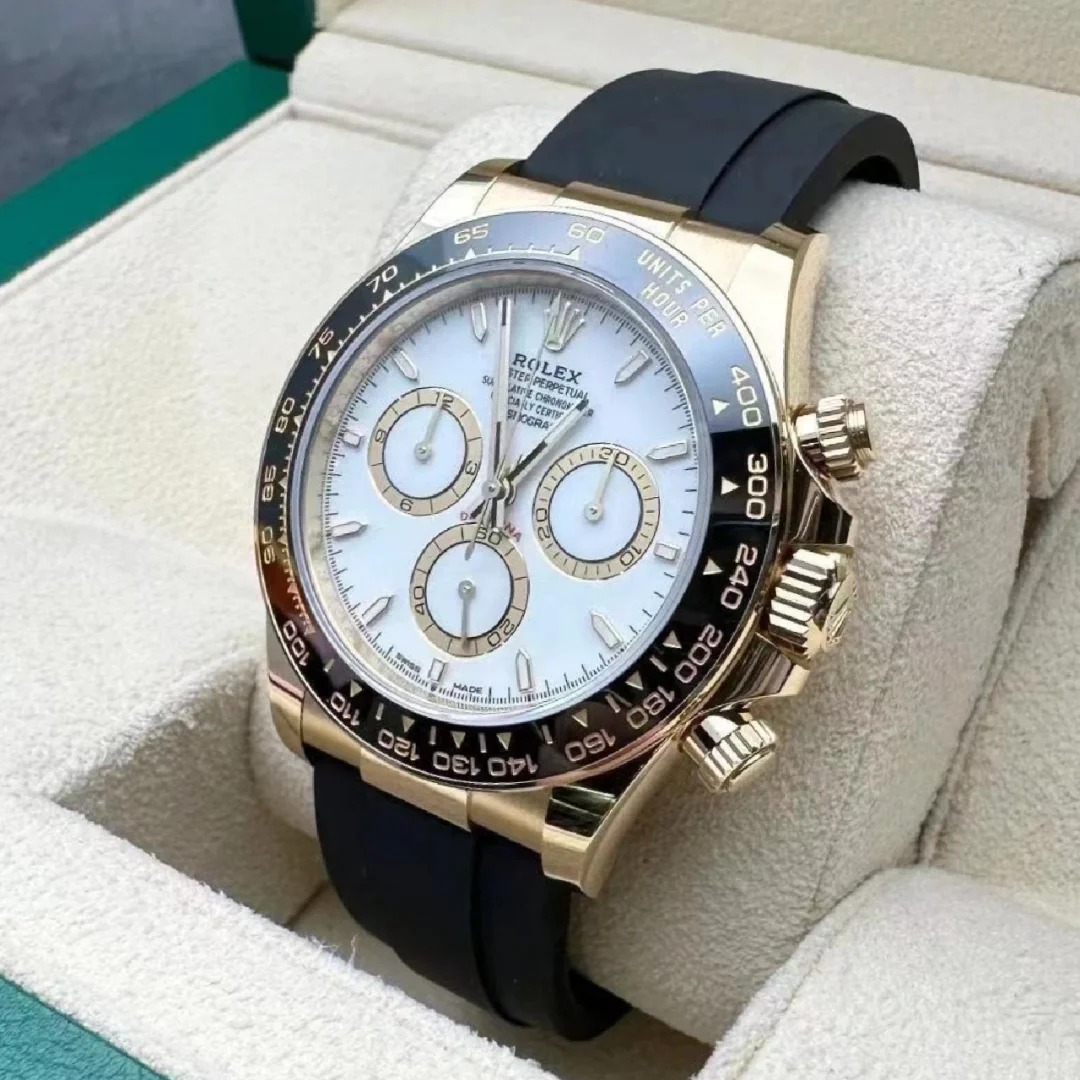 The Oyster Perpetual Cosmograph Daytona in 18 ct yellow gold with a white dial and contrasting counters. The watch is fitted with an Oysterflex strap with a tachymeter on a black Cerachrom bezel. -m126518ln-0002 40mm