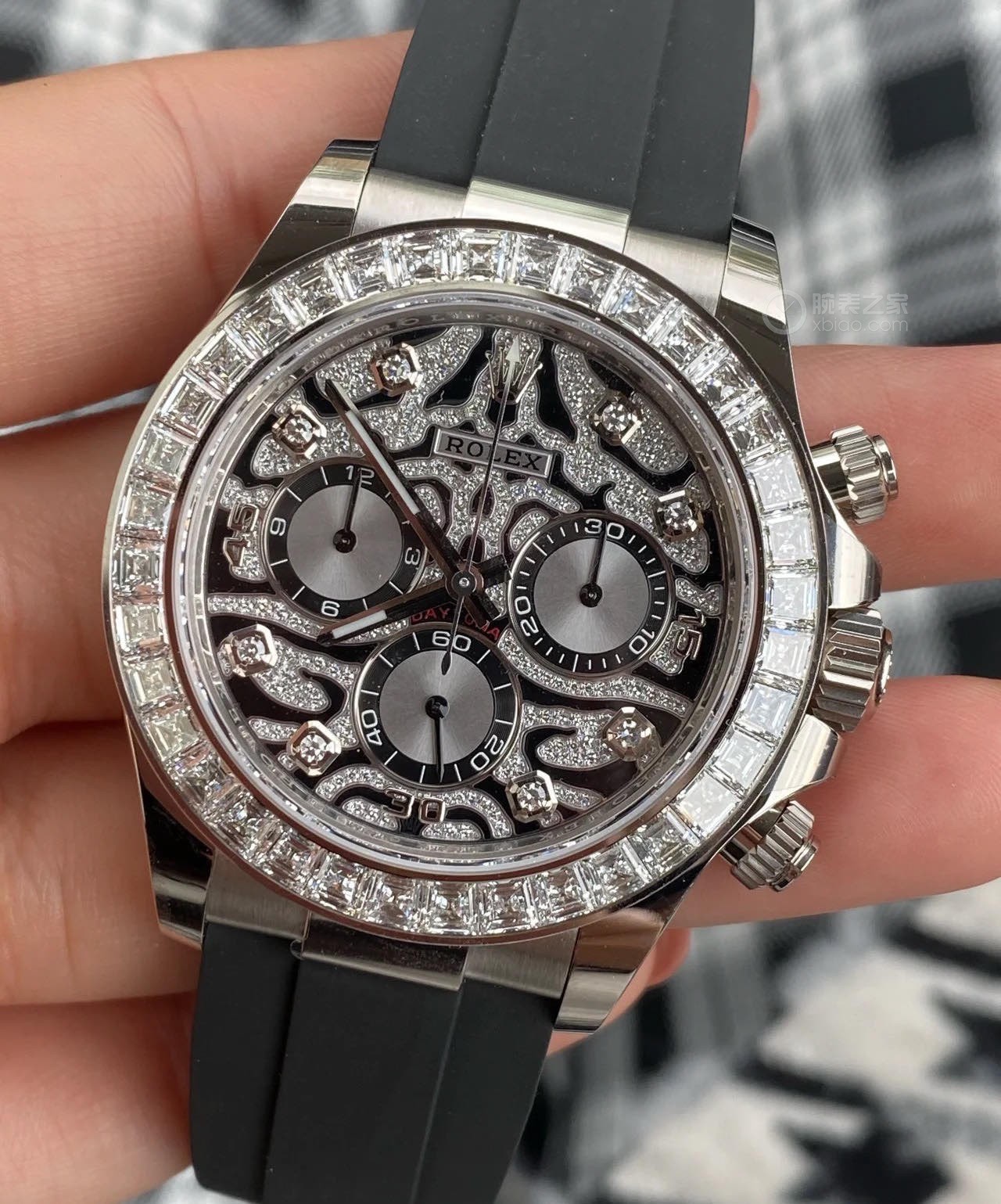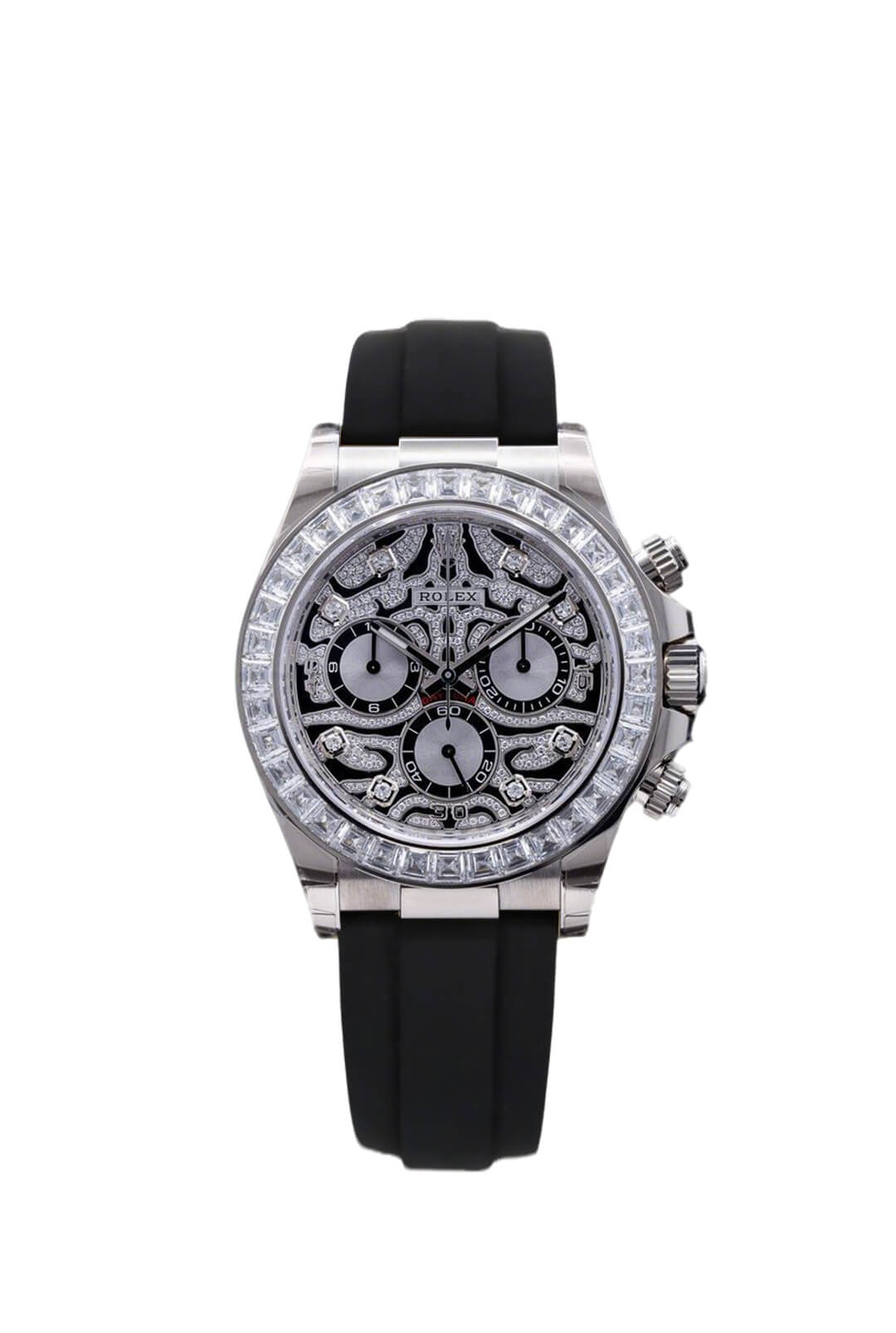 The Oyster Perpetual Cosmograph Daytona in 18K white gold features a diamond-set gloss black and stainless steel dial and an Oysterflex bracelet with a black Cerachrom bezel with a tachymeter. -m126519ln-0004 40mm
