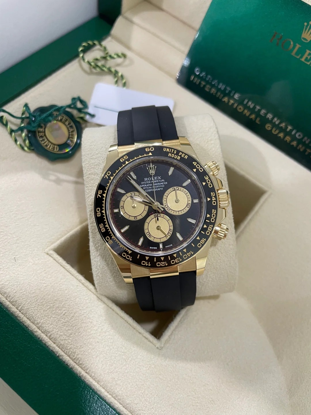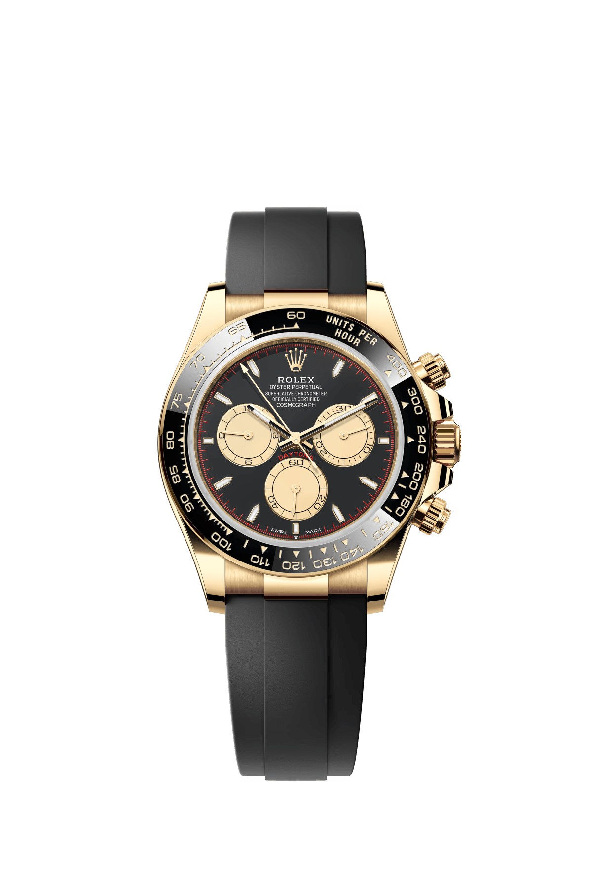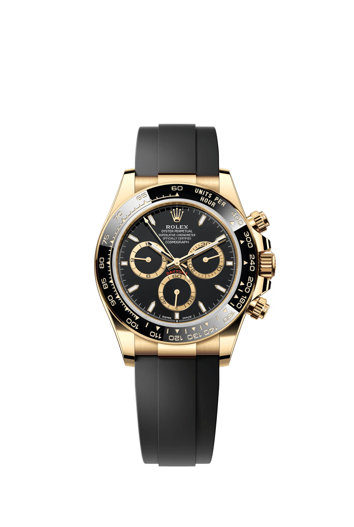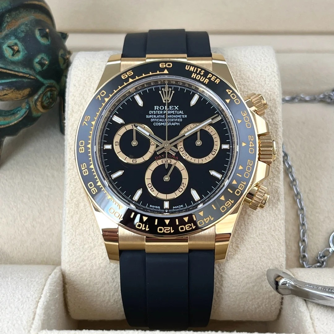 The Oyster Perpetual Cosmograph Daytona in 18 ct yellow gold with a gold and gloss black dial and an Oysterflex strap with a black Cerachrom bezel with tachymeter. -m126518ln-0012 40mm