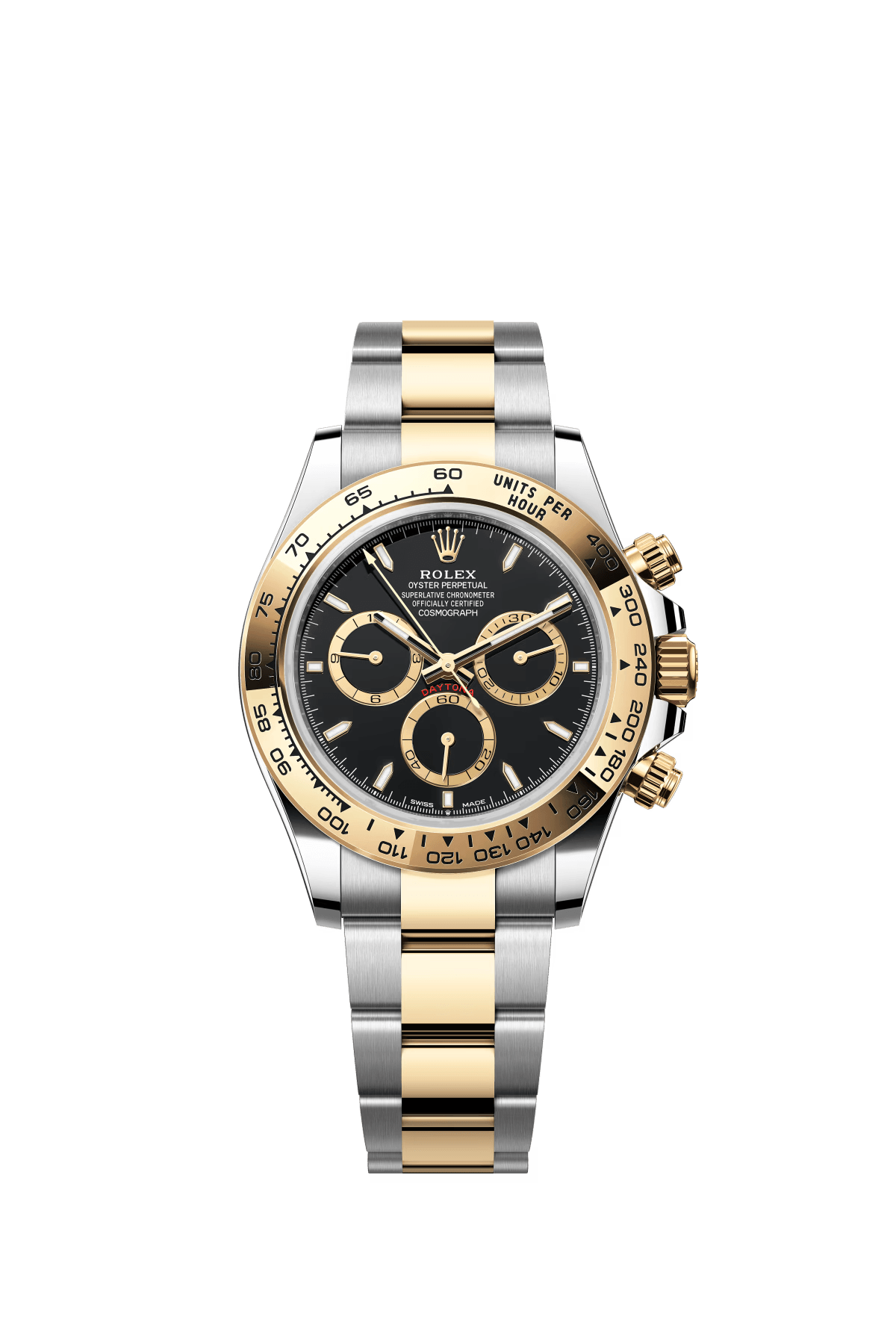 The Oyster Perpetual Cosmograph Daytona is available in yellow gold and Oystersteel with a black dial and contrasting counters. The watch is fitted with an Oyster bracelet with a tachymeter engraved on a yellow gold bezel. -m126503-0003 40mm