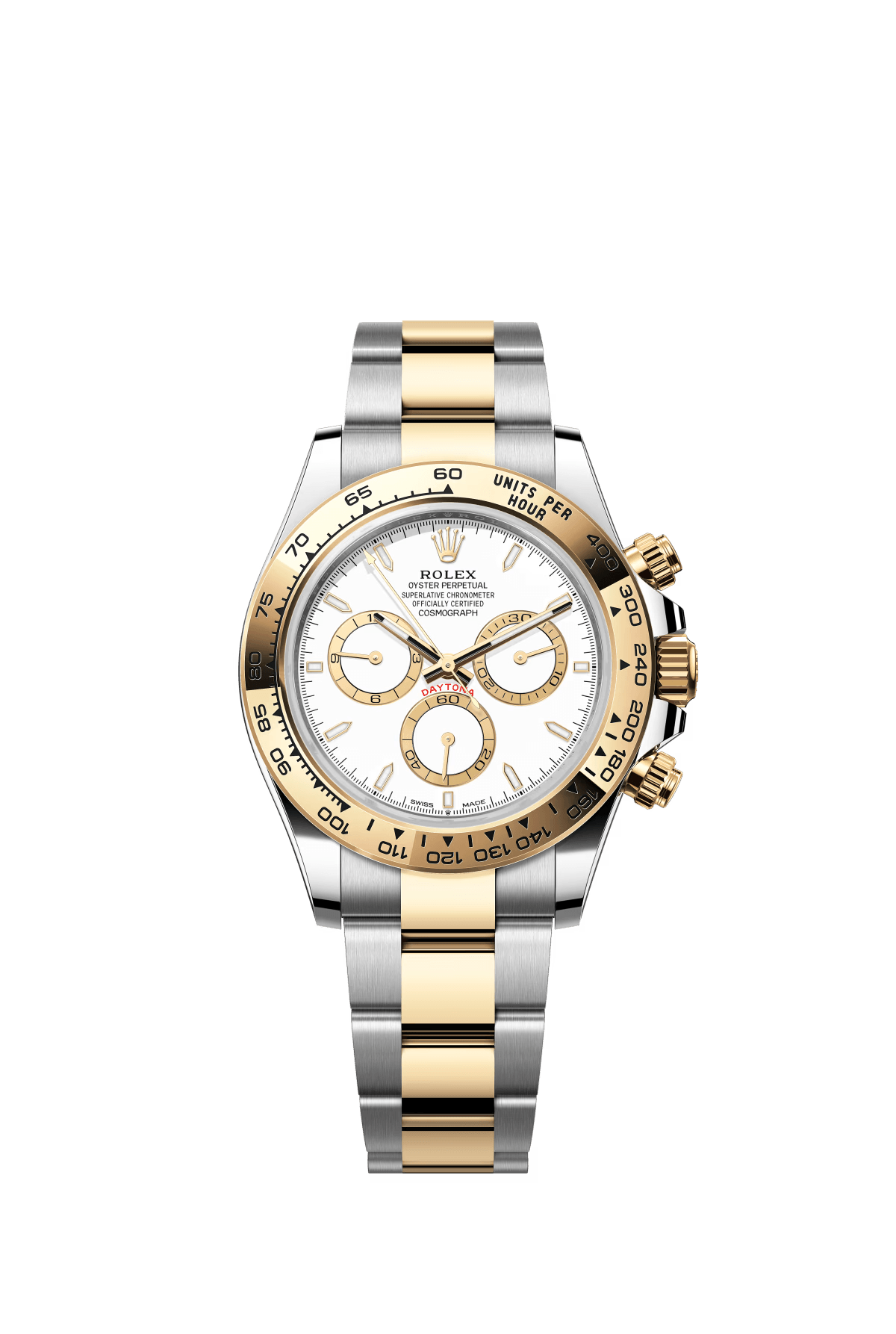 The Oyster Perpetual Cosmograph Daytona is available in yellow gold and Oystersteel with a white dial and contrasting counters. The watch is fitted with an Oyster bracelet with a tachymeter engraved on a yellow gold bezel. -m126503-0001 40mm