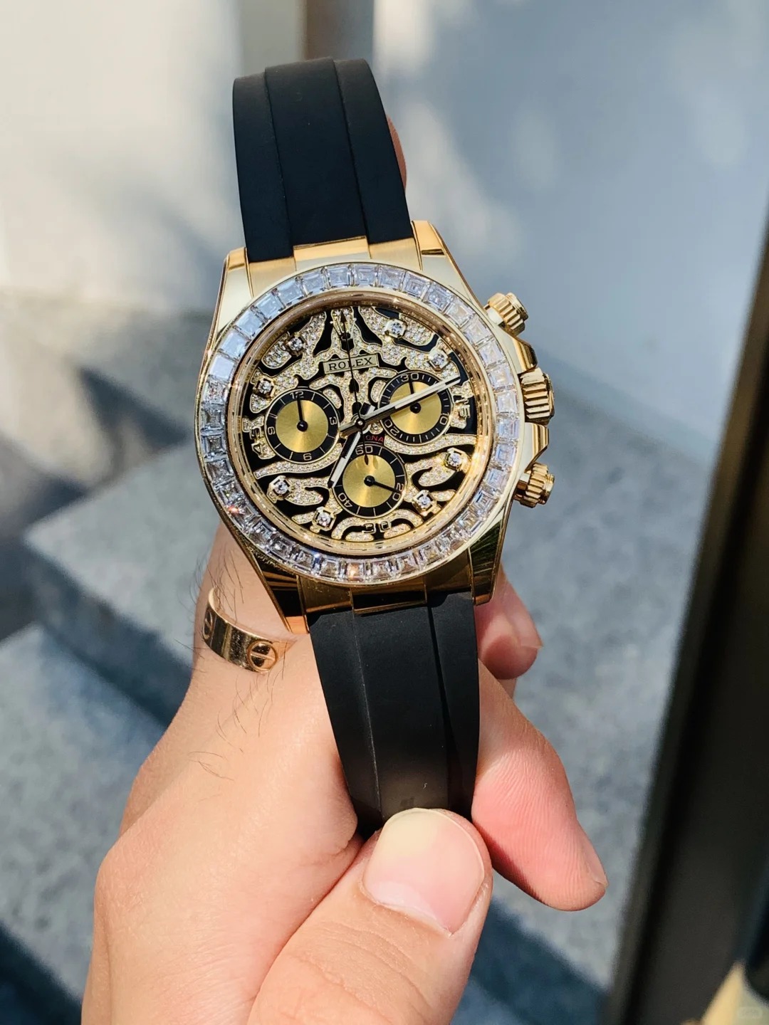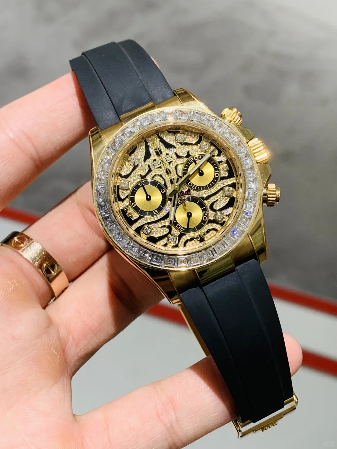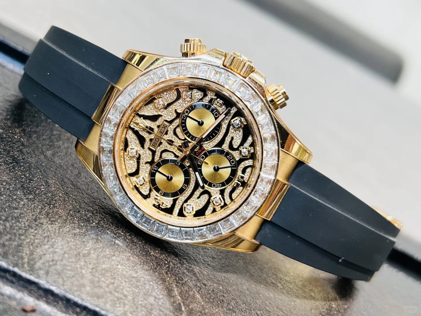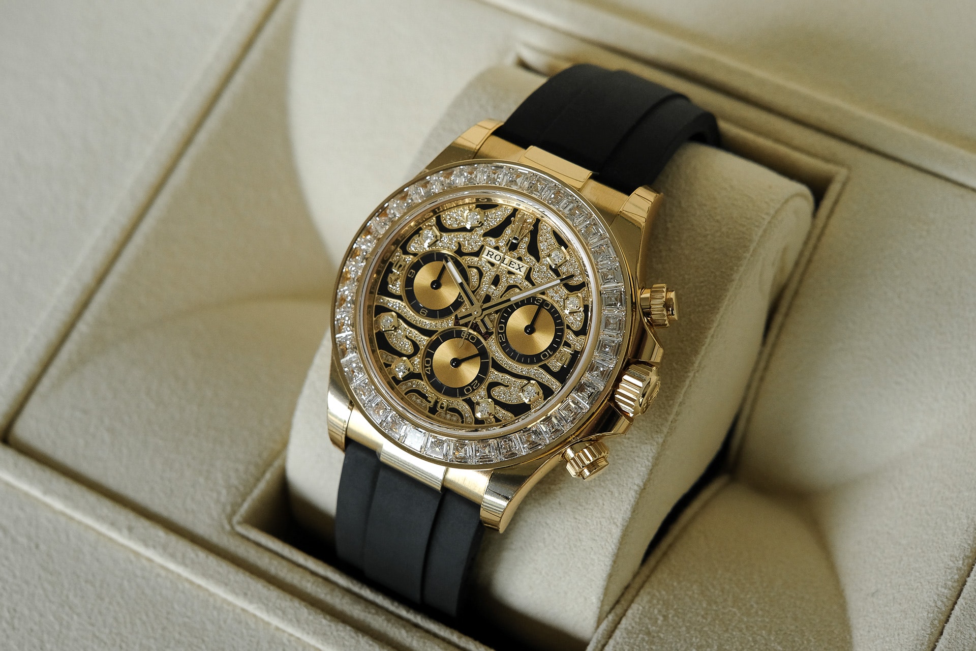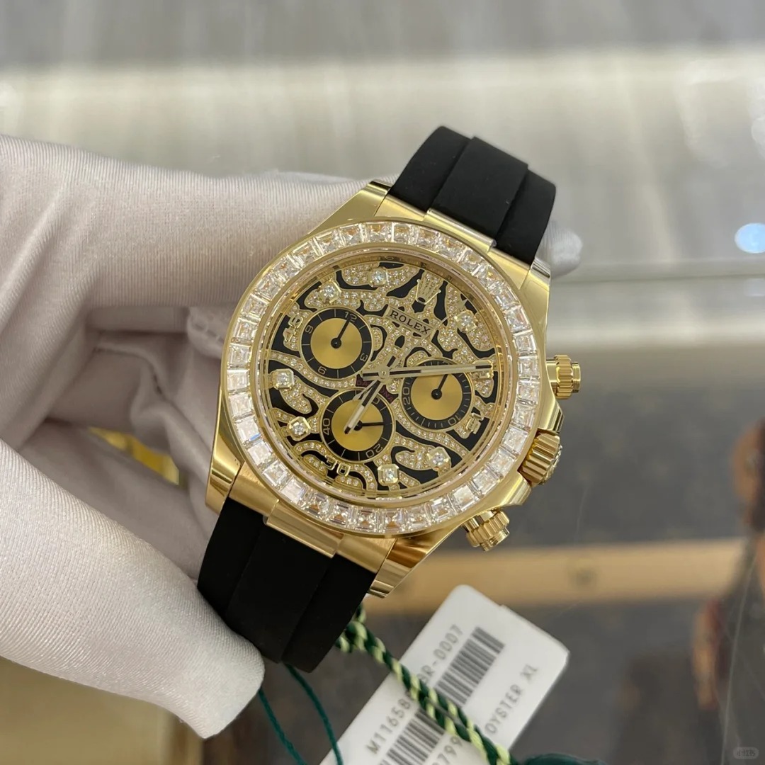 A Rolex Daytona with diamonds is not something new but one with a dial like the 116588TBR sure is! The black-lacquered dial has an applied 18k yellow-gold and diamond-set. wavy structure on the surface. which can remind you of a tiger's fur.