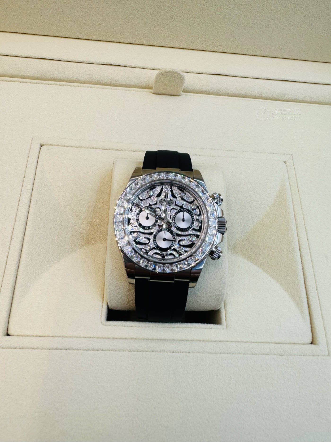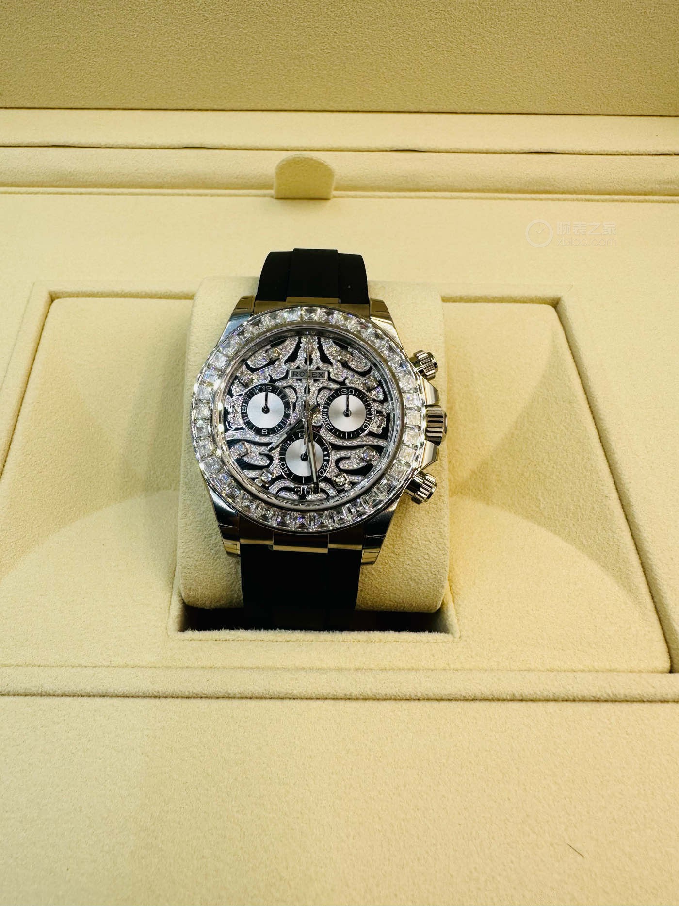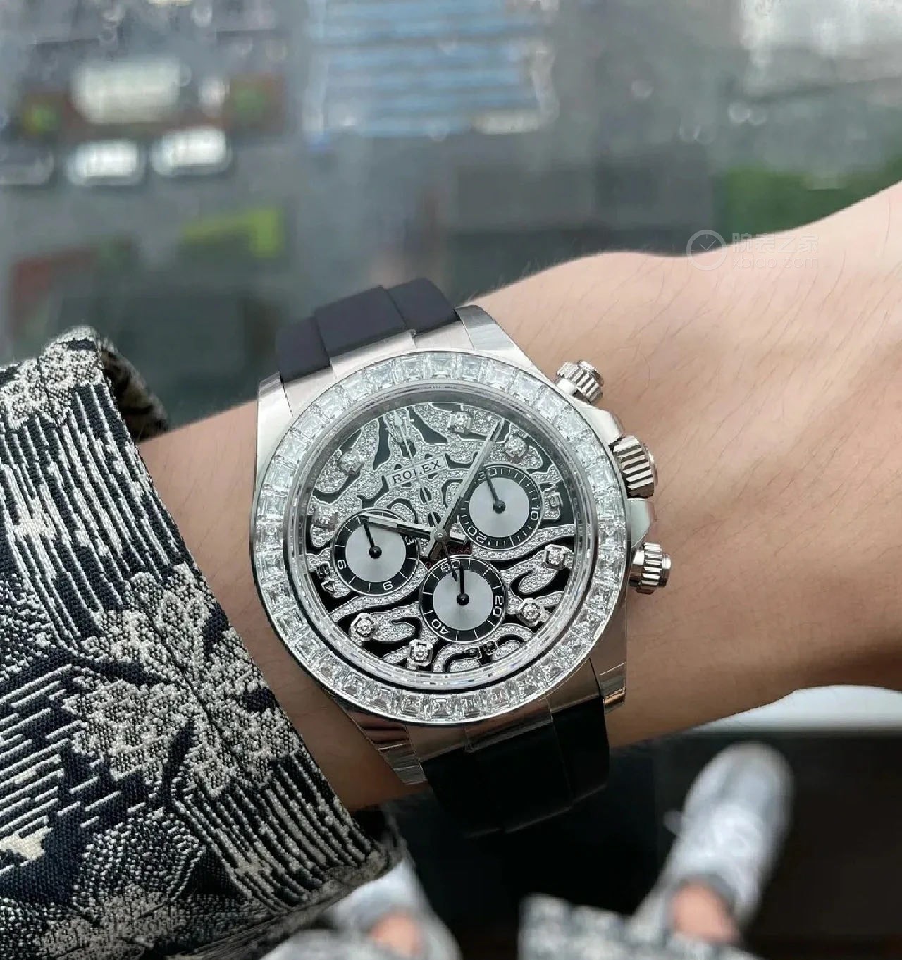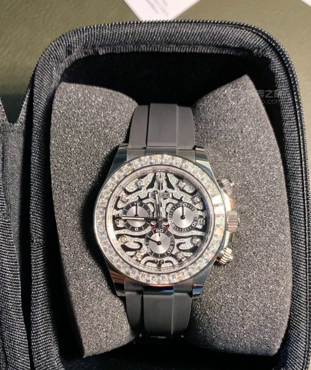 A Rolex Daytona with diamonds is not something new but one with a dial like the 116588TBR sure is! The black-lacquered dial has an applied 18k yellow-gold and diamond-set. wavy structure on the surface. which can remind you of a tiger's fur.
