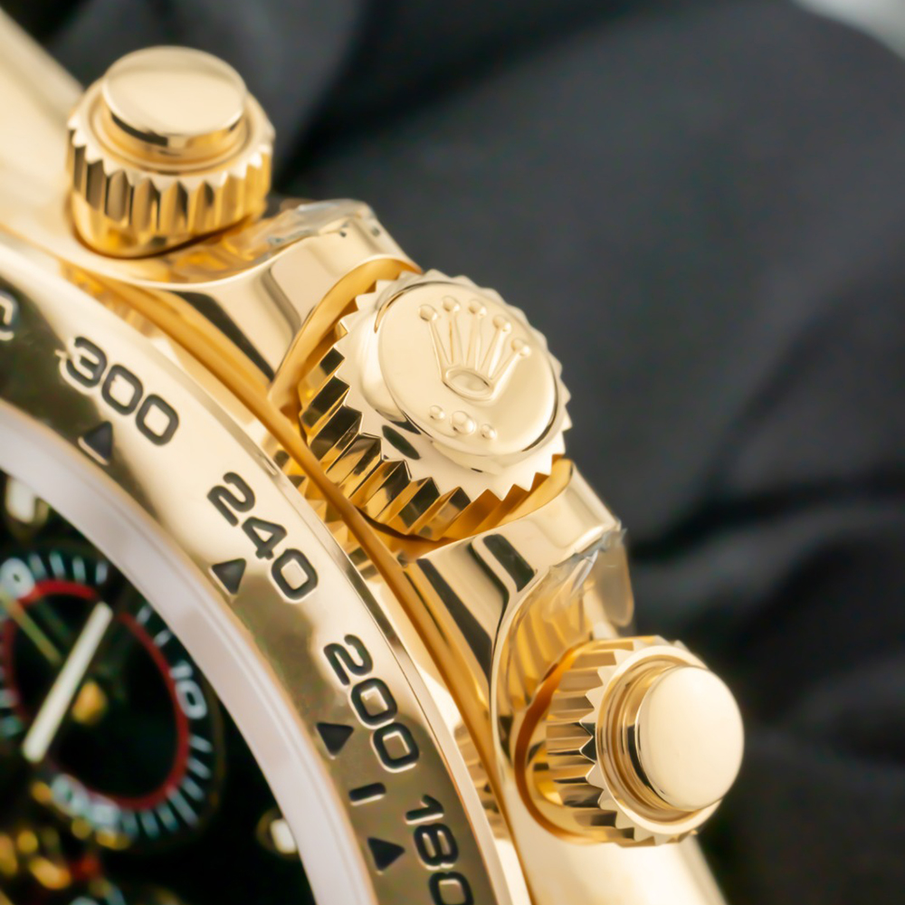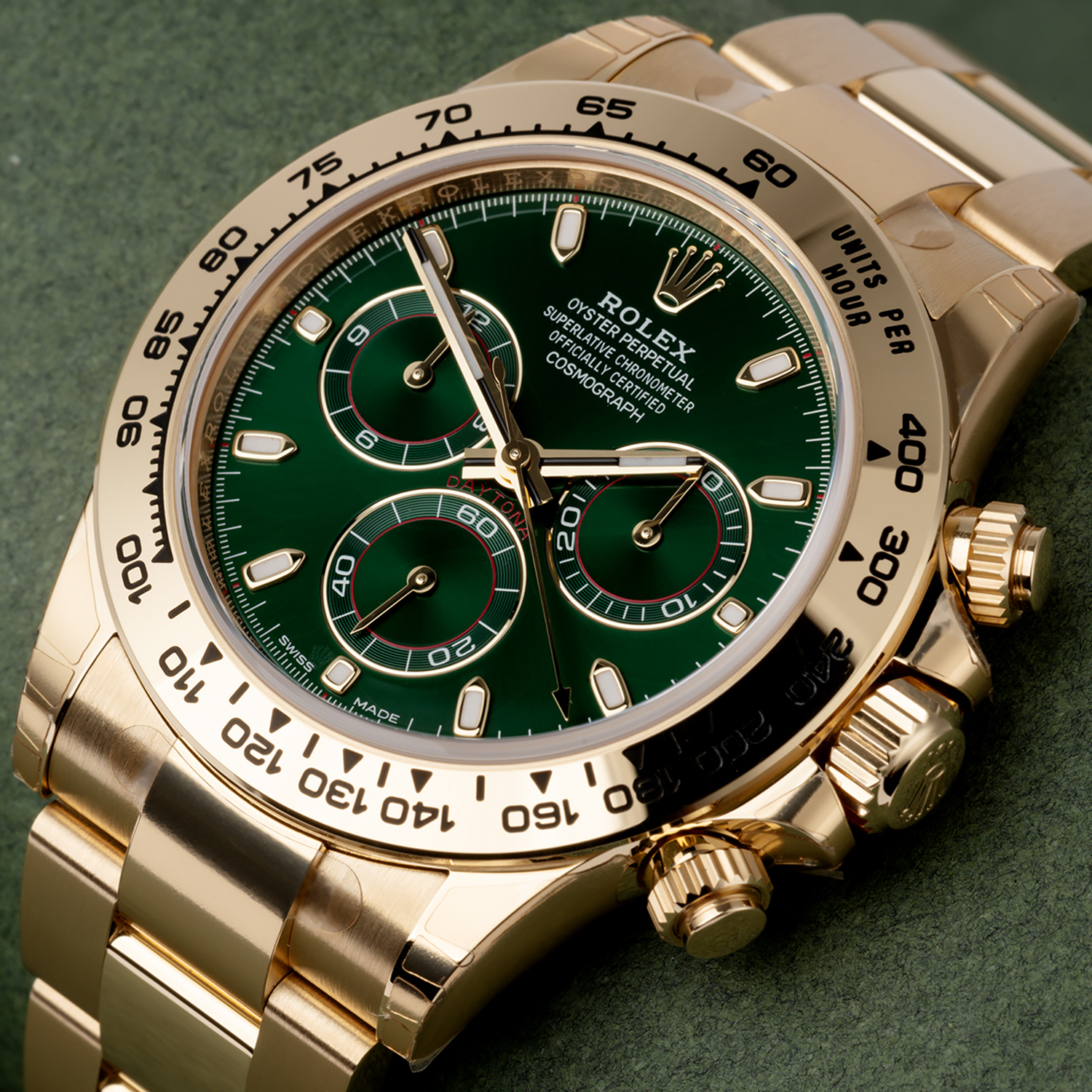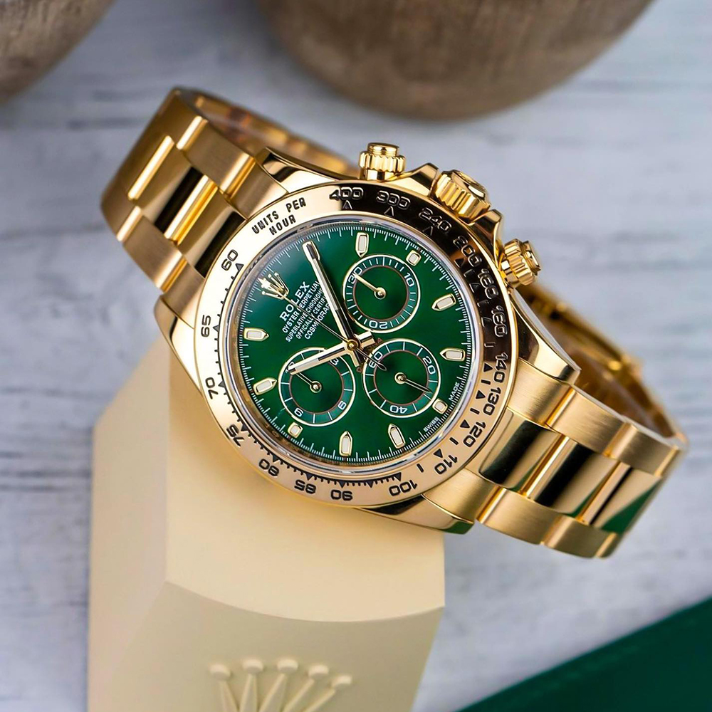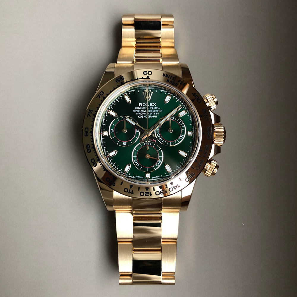 8kt yellow gold case with an 18kt yellow gold bracelet. Fixed 18kt yellow gold bezel showing tachymeter markings. Green dial with luminous yellow gold hands and index hour markers. Minute markers around the outer rim. Dial Type: Analog. Luminescent hands and markers. Chronograph - three Green sub-dials displaying: 60 second. 30 minutes. and 1/10th of a second. Automatic movement with a 72-hour power reserve. Scratch-resistant sapphire crystal. Screw down crown. Solid case back. Case diameter: 40 mm. Case thickness: 12.5 mm. Round case shape. Band width: 14.5 mm / 20 mm. Band length: 7.5 inches. Oyster clasp. Water-resistant at 100 meters / 330 feet. Functions: chronograph. hour. minute. second.