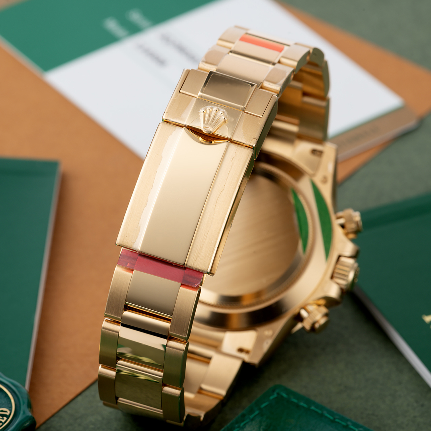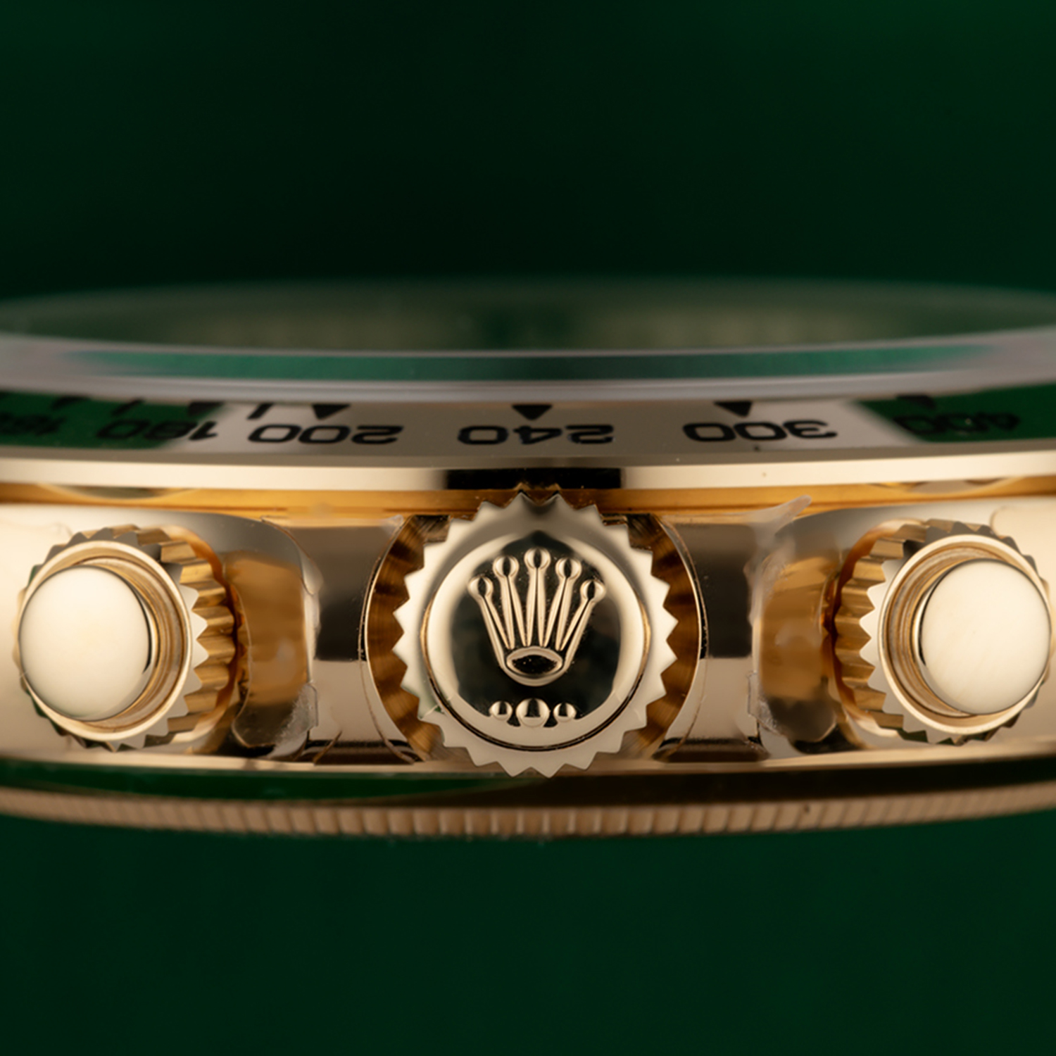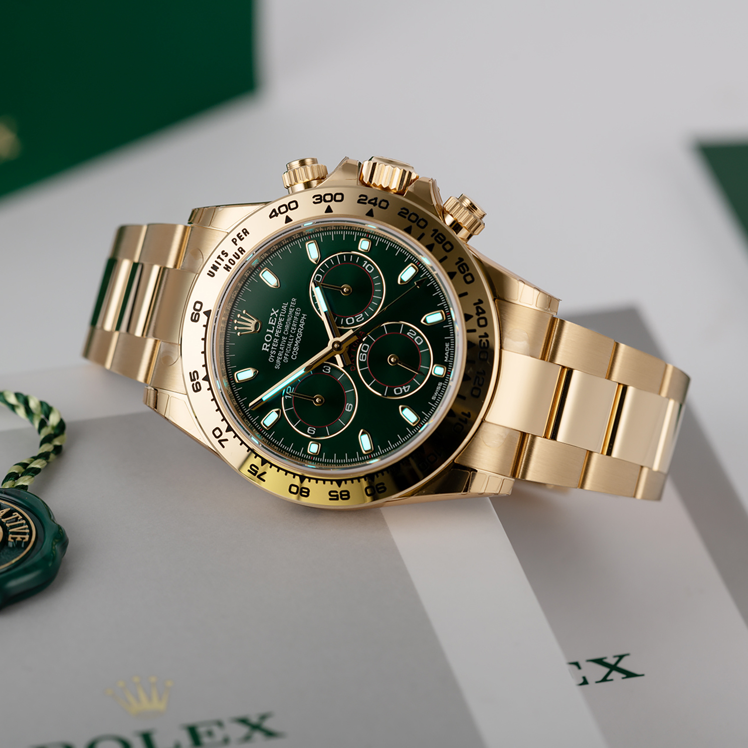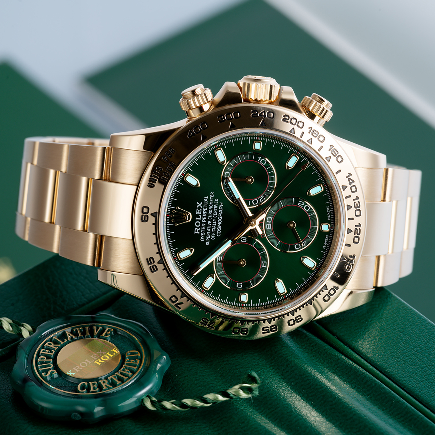 8kt yellow gold case with an 18kt yellow gold bracelet. Fixed 18kt yellow gold bezel showing tachymeter markings. Green dial with luminous yellow gold hands and index hour markers. Minute markers around the outer rim. Dial Type: Analog. Luminescent hands and markers. Chronograph - three Green sub-dials displaying: 60 second. 30 minutes. and 1/10th of a second. Automatic movement with a 72-hour power reserve. Scratch-resistant sapphire crystal. Screw down crown. Solid case back. Case diameter: 40 mm. Case thickness: 12.5 mm. Round case shape. Band width: 14.5 mm / 20 mm. Band length: 7.5 inches. Oyster clasp. Water-resistant at 100 meters / 330 feet. Functions: chronograph. hour. minute. second.