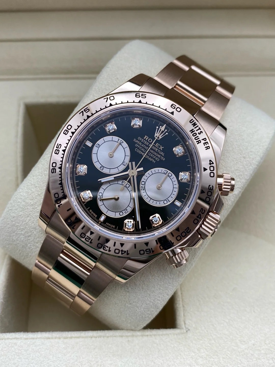• The Oyster Perpetual Cosmograph Daytona in 18 ct Everose gold features a diamond-set gloss black and sunrise gold dial and an Oyster bracelet with an engraved tachymeter on an 18-carat Everose gold bezel. -m126505-0002 40mm