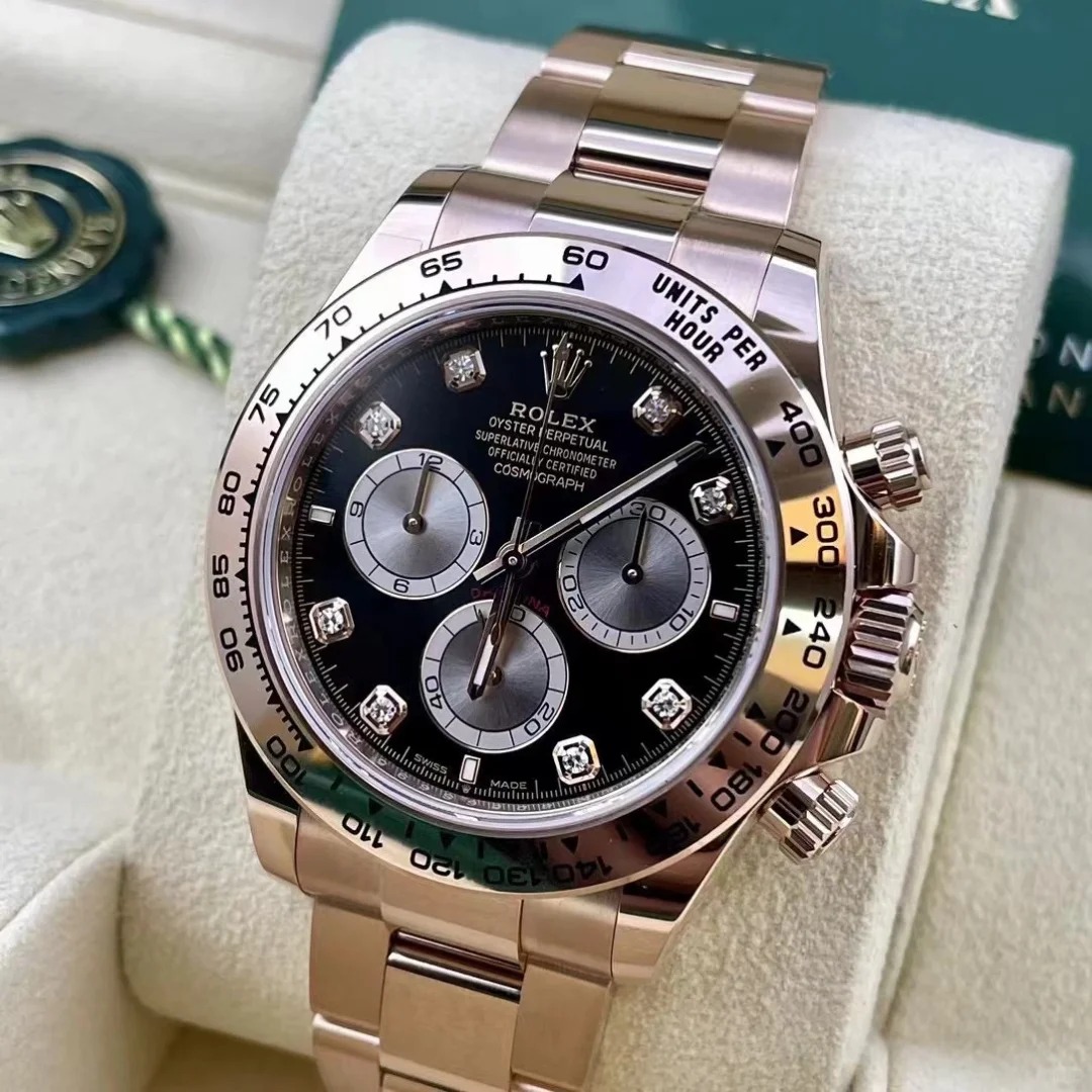 The Oyster Perpetual Cosmograph Daytona in 18 ct Everose gold features a diamond-set gloss black and sunrise gold dial and an Oyster bracelet with an engraved tachymeter on an 18-carat Everose gold bezel. -m126505-0002 40mm