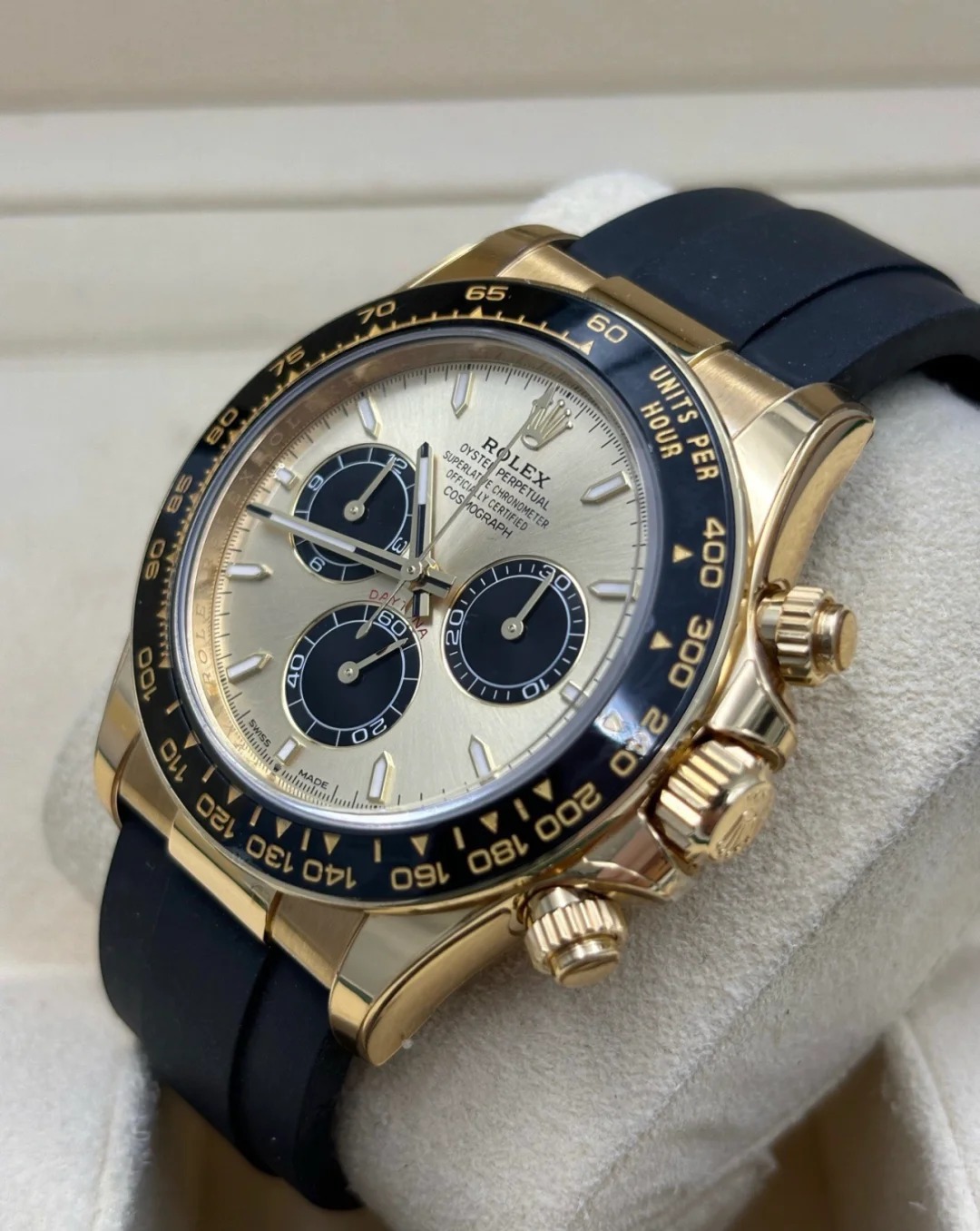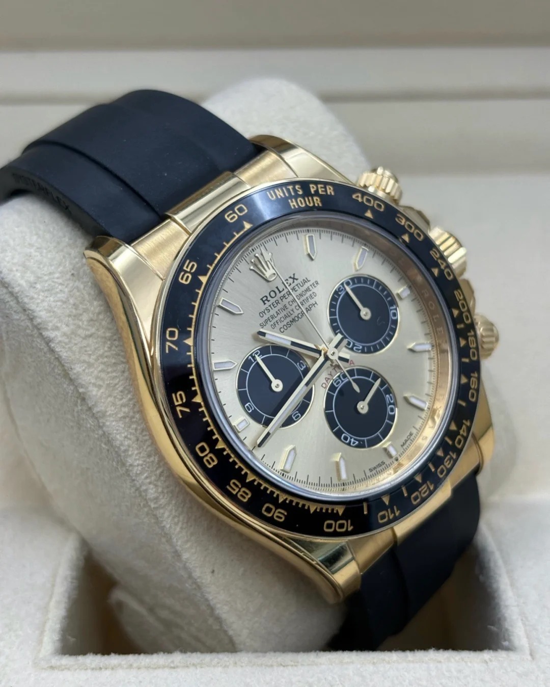The Oyster Perpetual Cosmograph Daytona in 18 ct yellow gold with a gold and gloss black dial and an Oysterflex strap with a black Cerachrom bezel with tachymeter. -m126518ln-0012 40mm