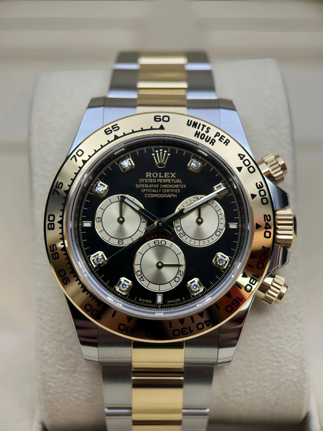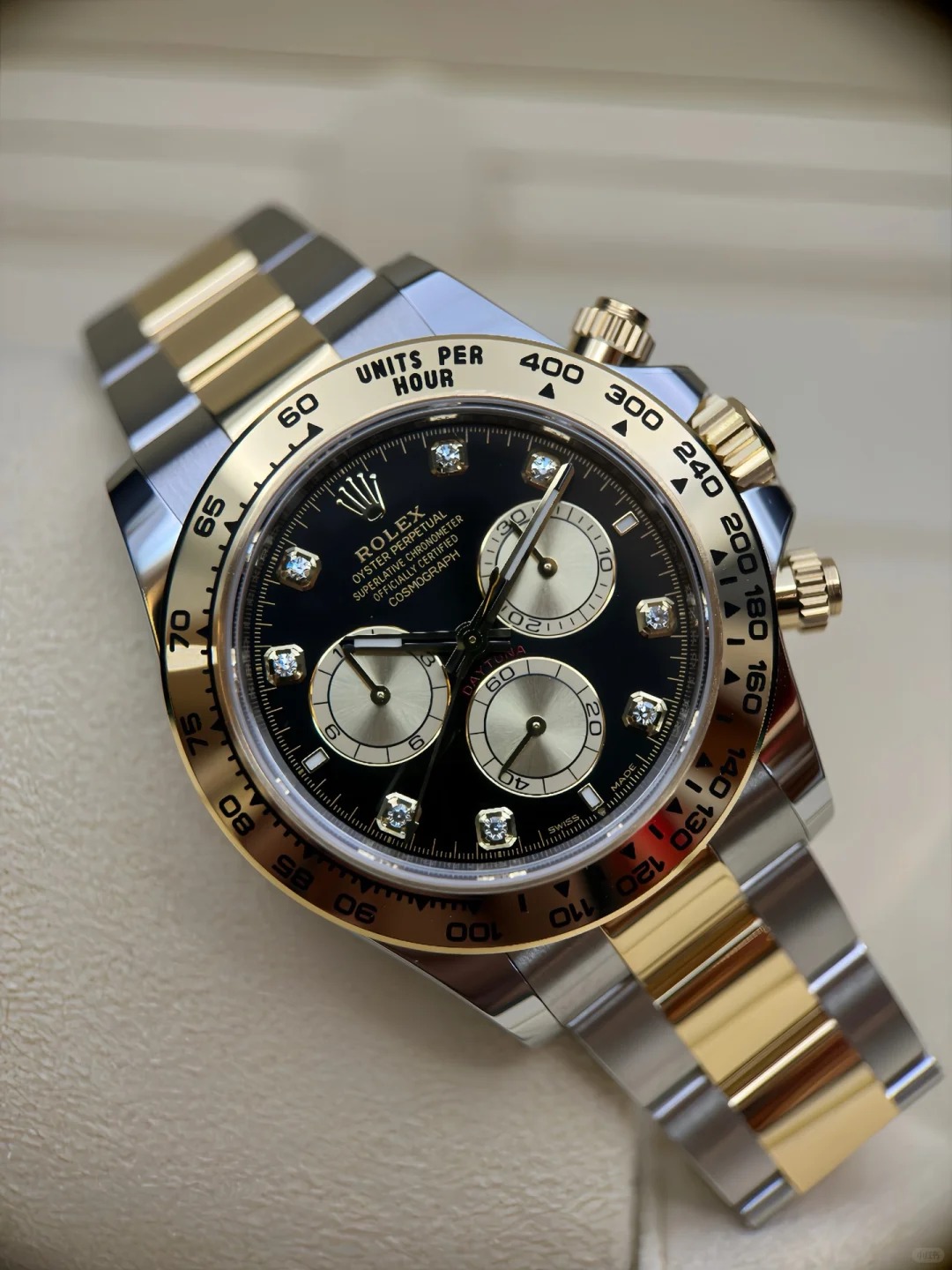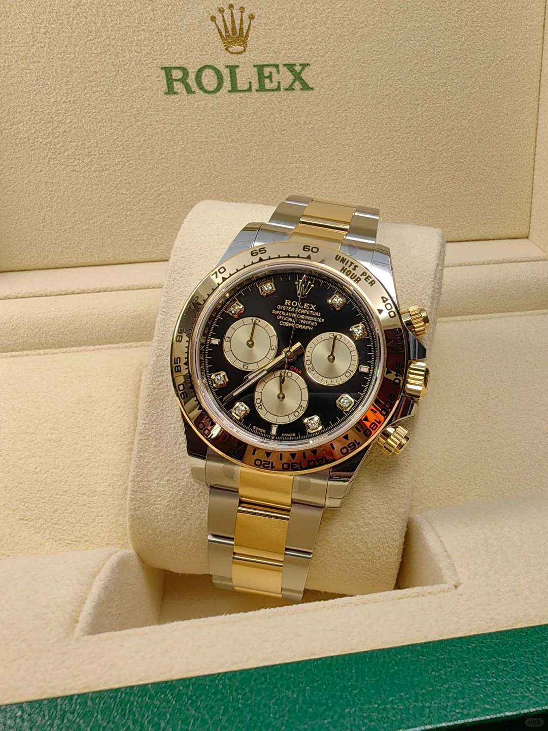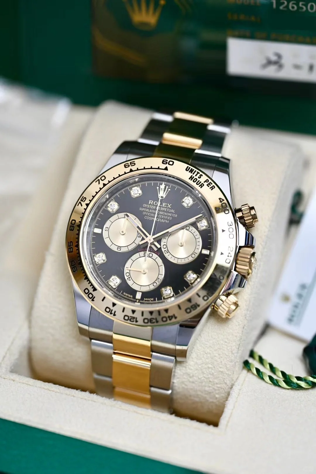 The Oyster Perpetual Cosmograph Daytona in yellow gold and Oystersteel features a diamond-set shiny black and gold dial and an Oyster bracelet with a tachymeter engraved on a yellow gold bezel. -m126503-0002 40mm