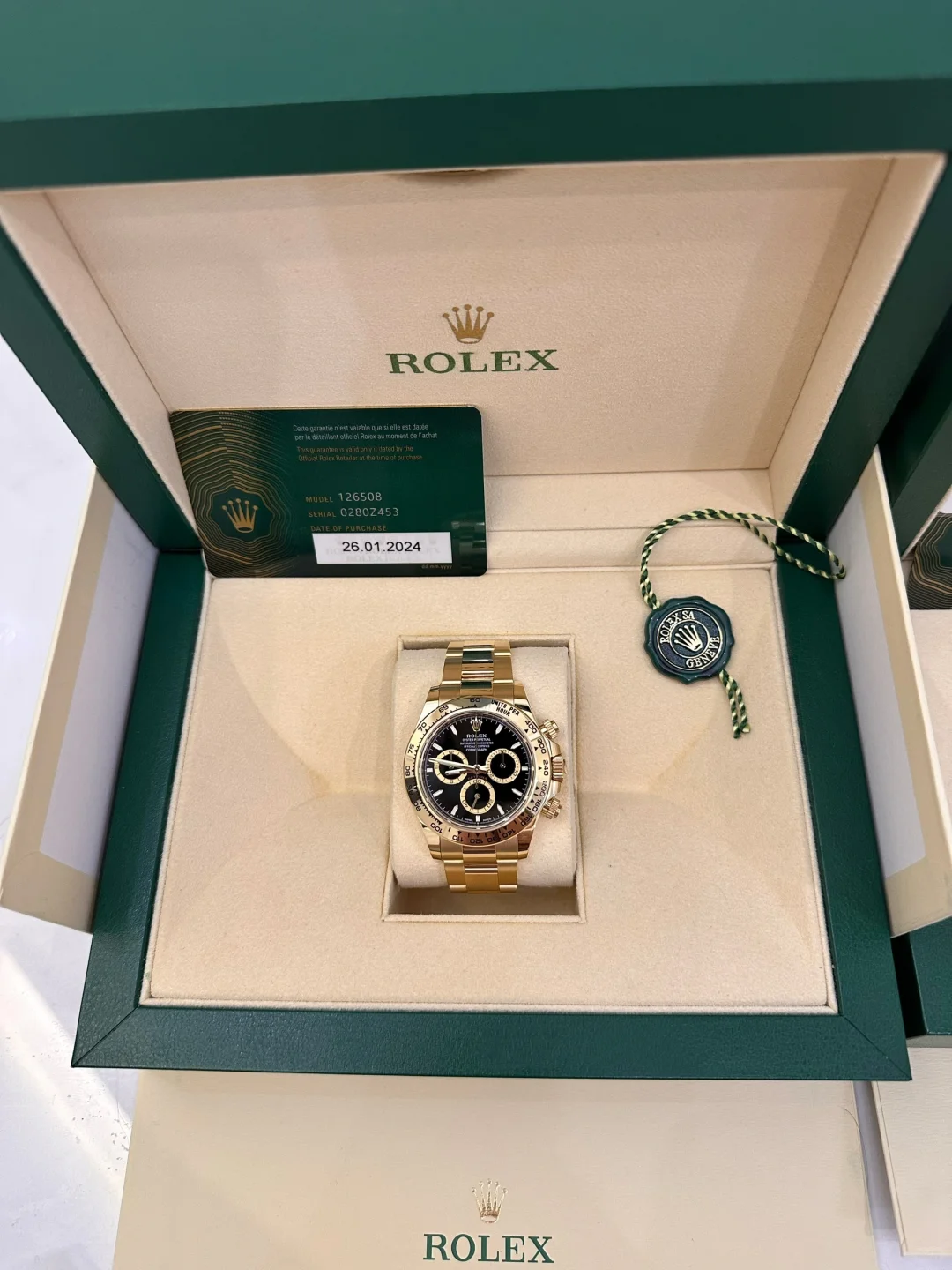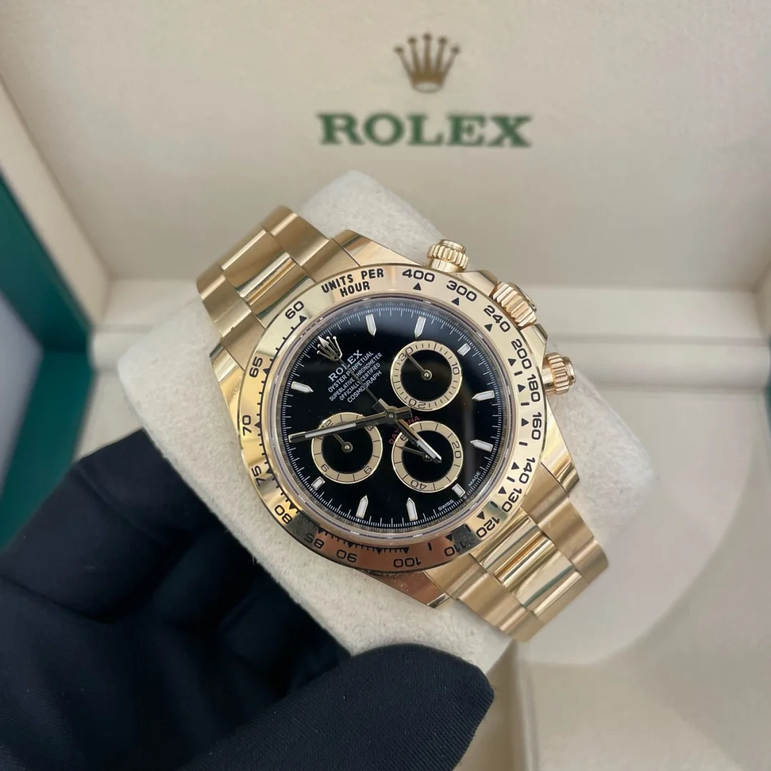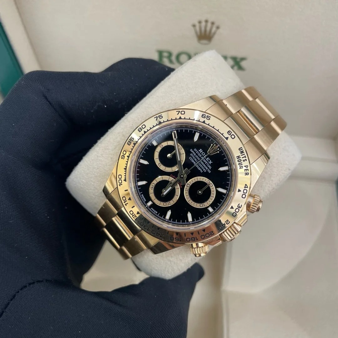The Oyster Perpetual Cosmograph Daytona is available in 18 ct yellow gold with a black dial and contrasting counters. The watch is fitted with an Oyster bracelet and an 18-carat yellow gold bezel engraved with a tachymeter. -m126508-0004 40mm