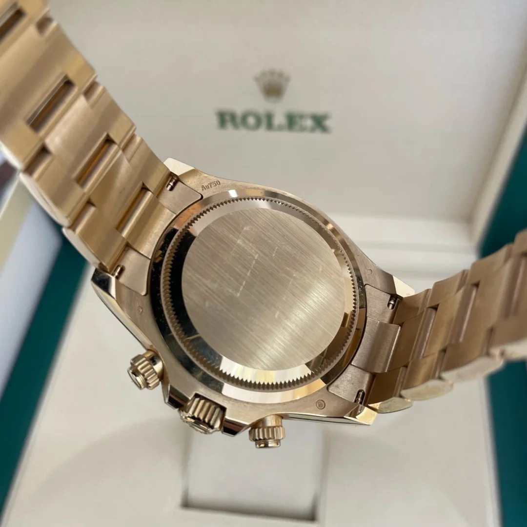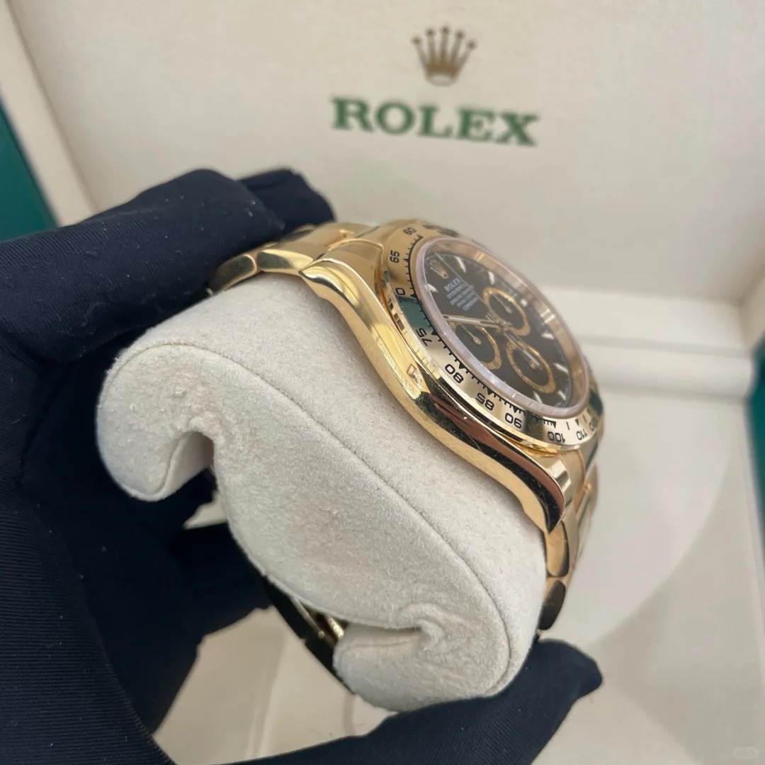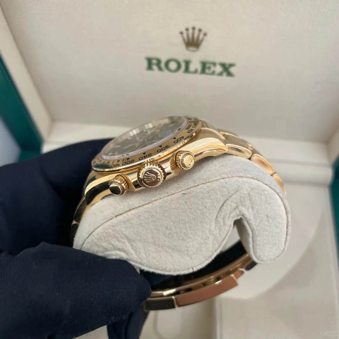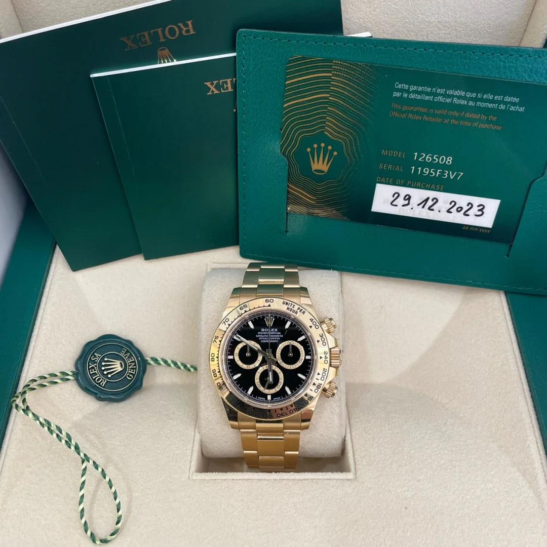 The Oyster Perpetual Cosmograph Daytona is available in 18 ct yellow gold with a black dial and contrasting counters. The watch is fitted with an Oyster bracelet and an 18-carat yellow gold bezel engraved with a tachymeter. -m126508-0004 40mm