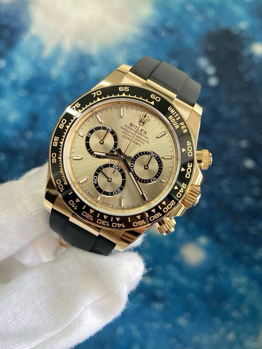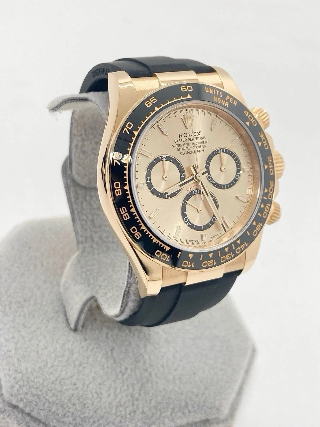The Oyster Perpetual Cosmograph Daytona is available in 18 ct yellow gold with a gold-toned dial and contrasting chronograph counters. The watch is fitted with an Oysterflex strap with a tachymeter on a black Cerachrom bezel. -m126518ln-0010 40mm