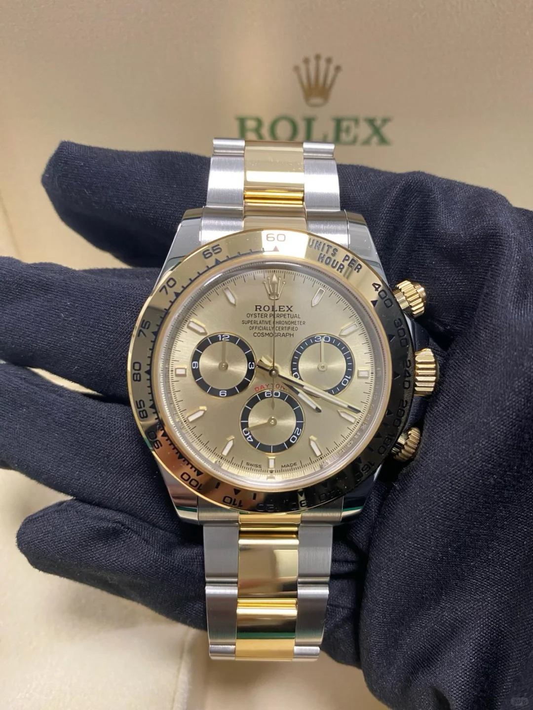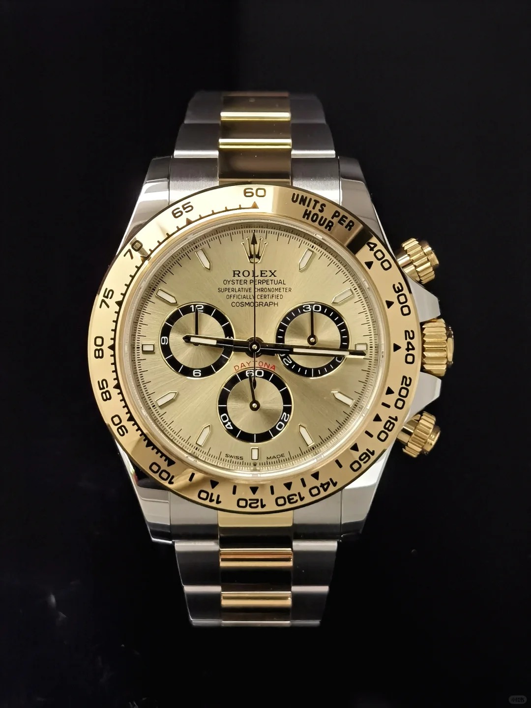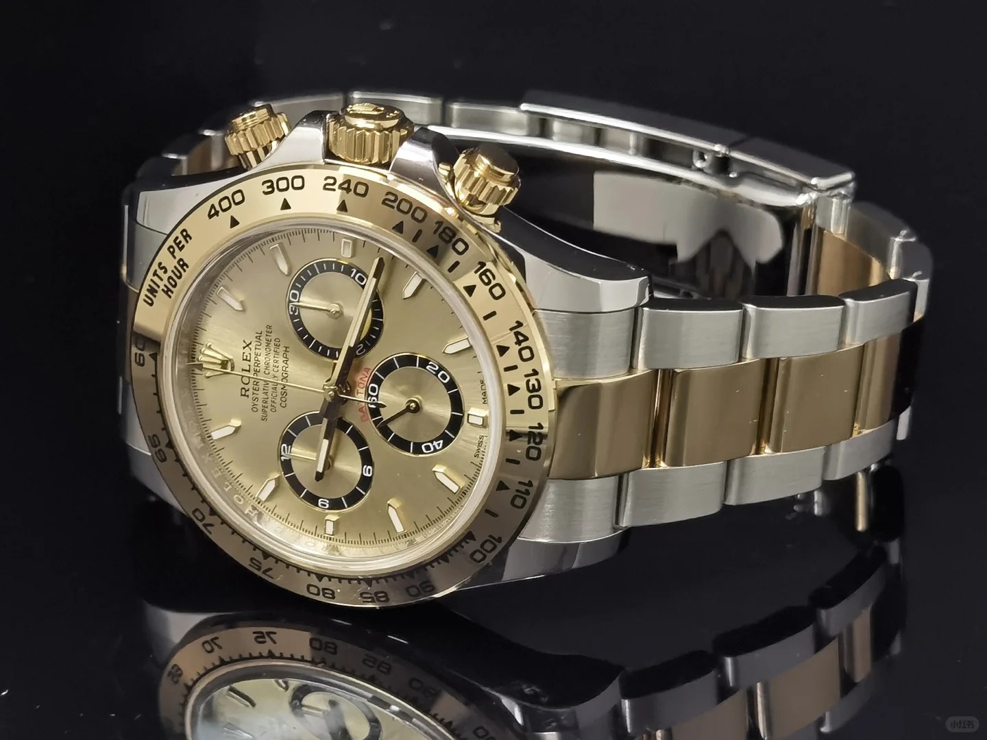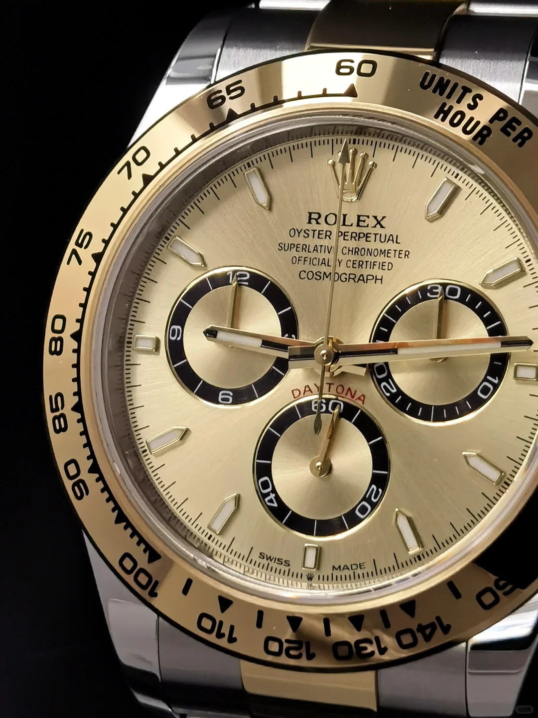 The Oyster Perpetual Cosmograph Daytona is available in yellow gold and Oystersteel with a gold dial and contrasting counters. The watch is fitted with an Oyster bracelet with a tachymeter engraved on a yellow gold bezel. -m126503-0004 40mm