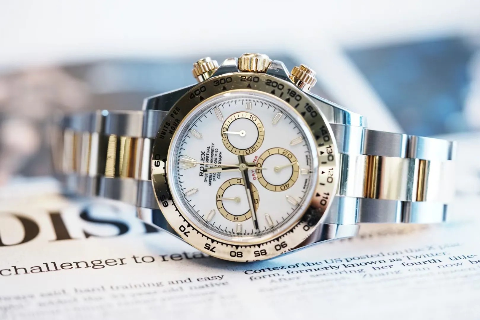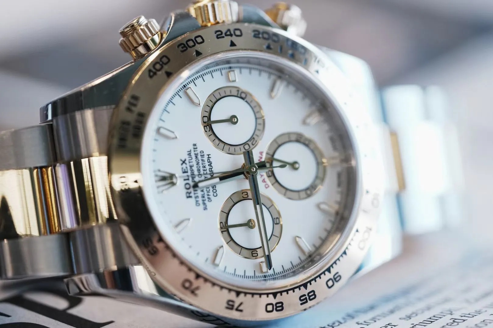• The Oyster Perpetual Cosmograph Daytona is available in yellow gold and Oystersteel with a white dial and contrasting counters. The watch is fitted with an Oyster bracelet with a tachymeter engraved on a yellow gold bezel. -m126503-0001 40mm