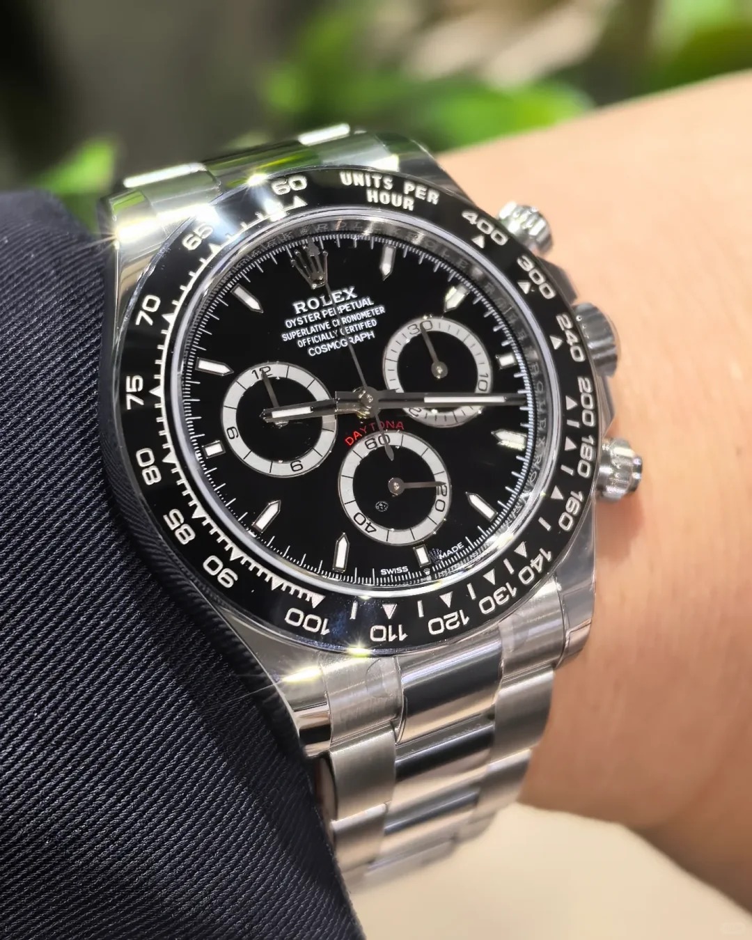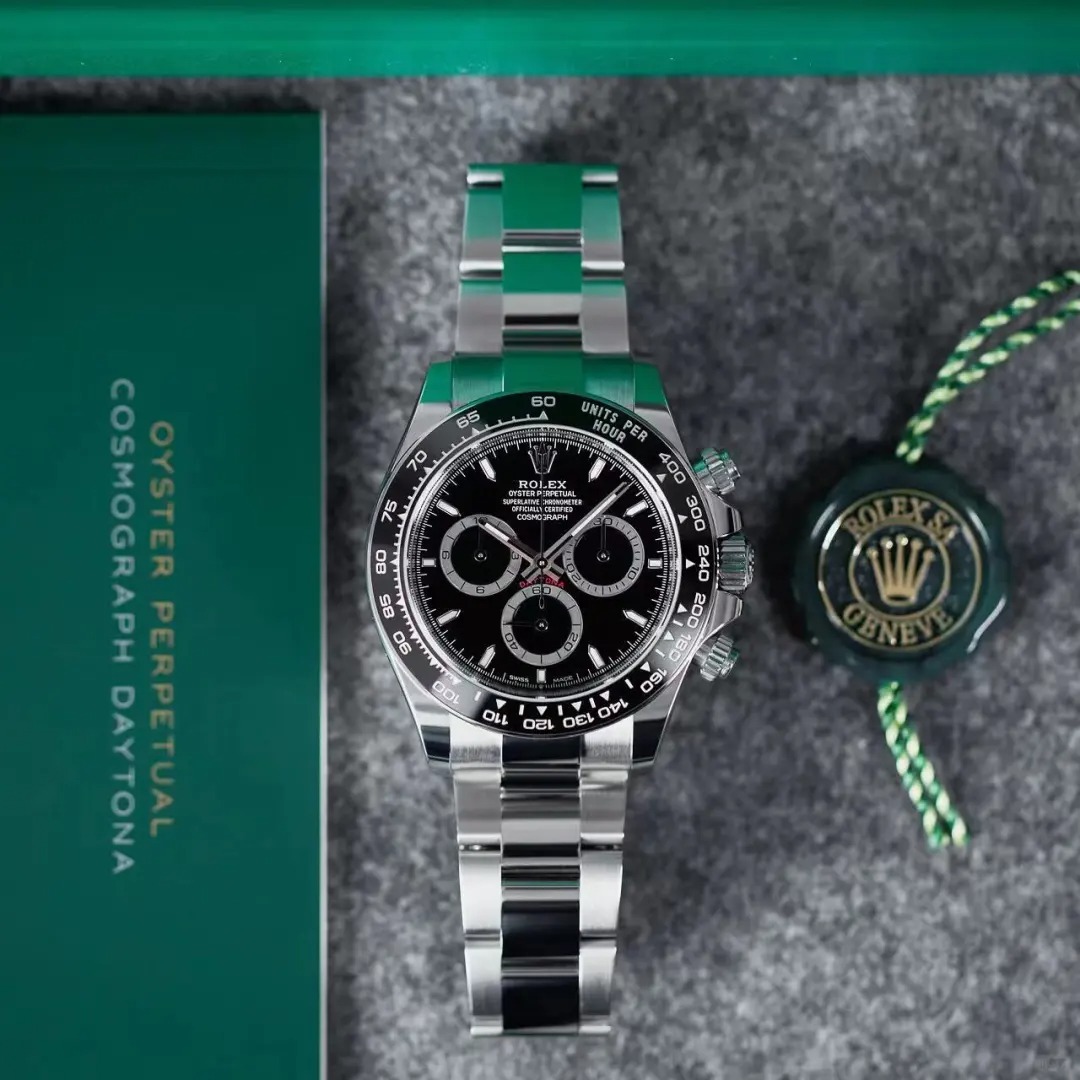 The Oyster Perpetual Cosmograph Daytona is made in Oyster steel with a black dial and contrasting counters. The watch is fitted with an Oyster bracelet and a black Cerachrom bezel with tachymeter. -m126500ln-0002 40mm