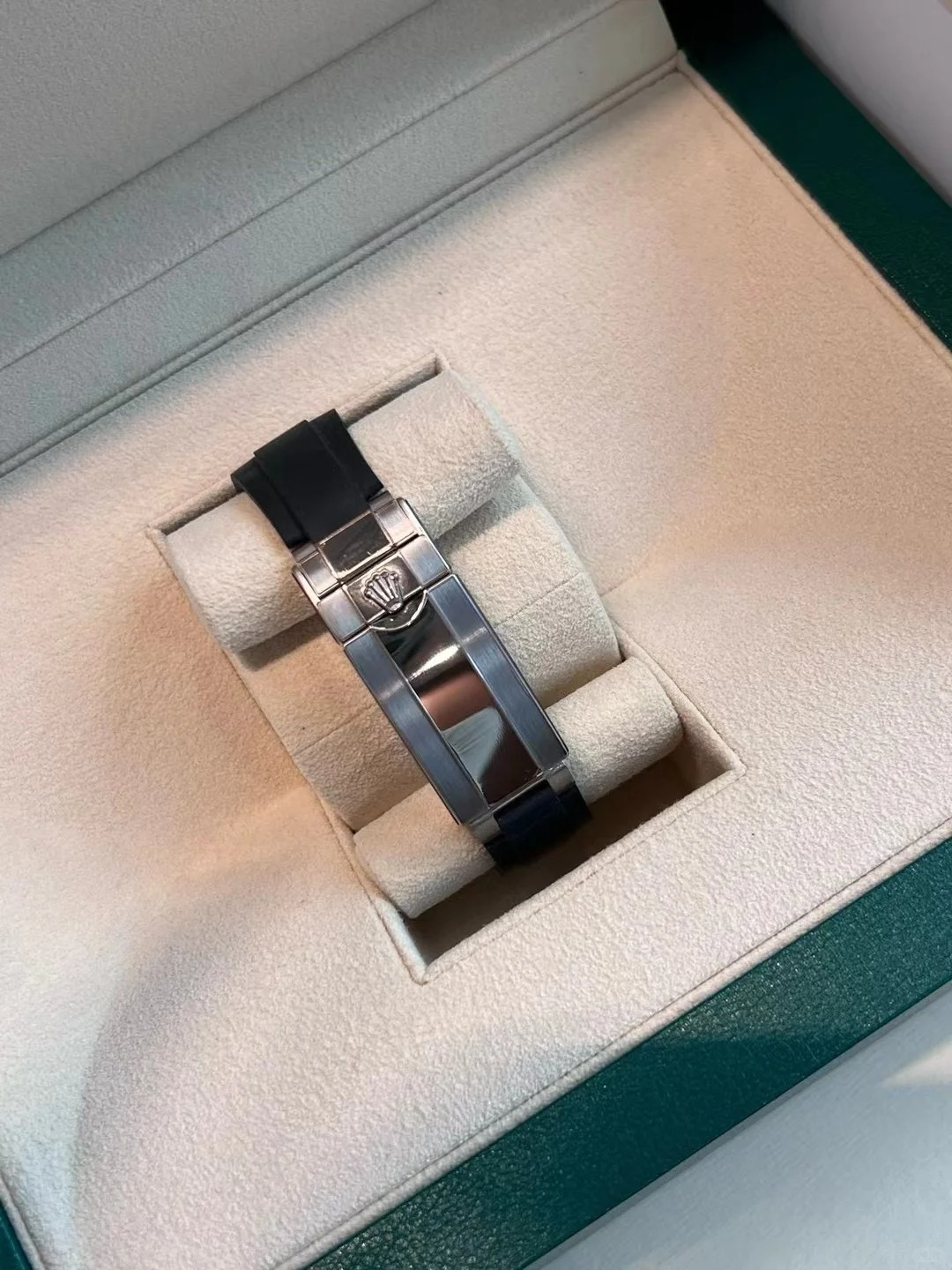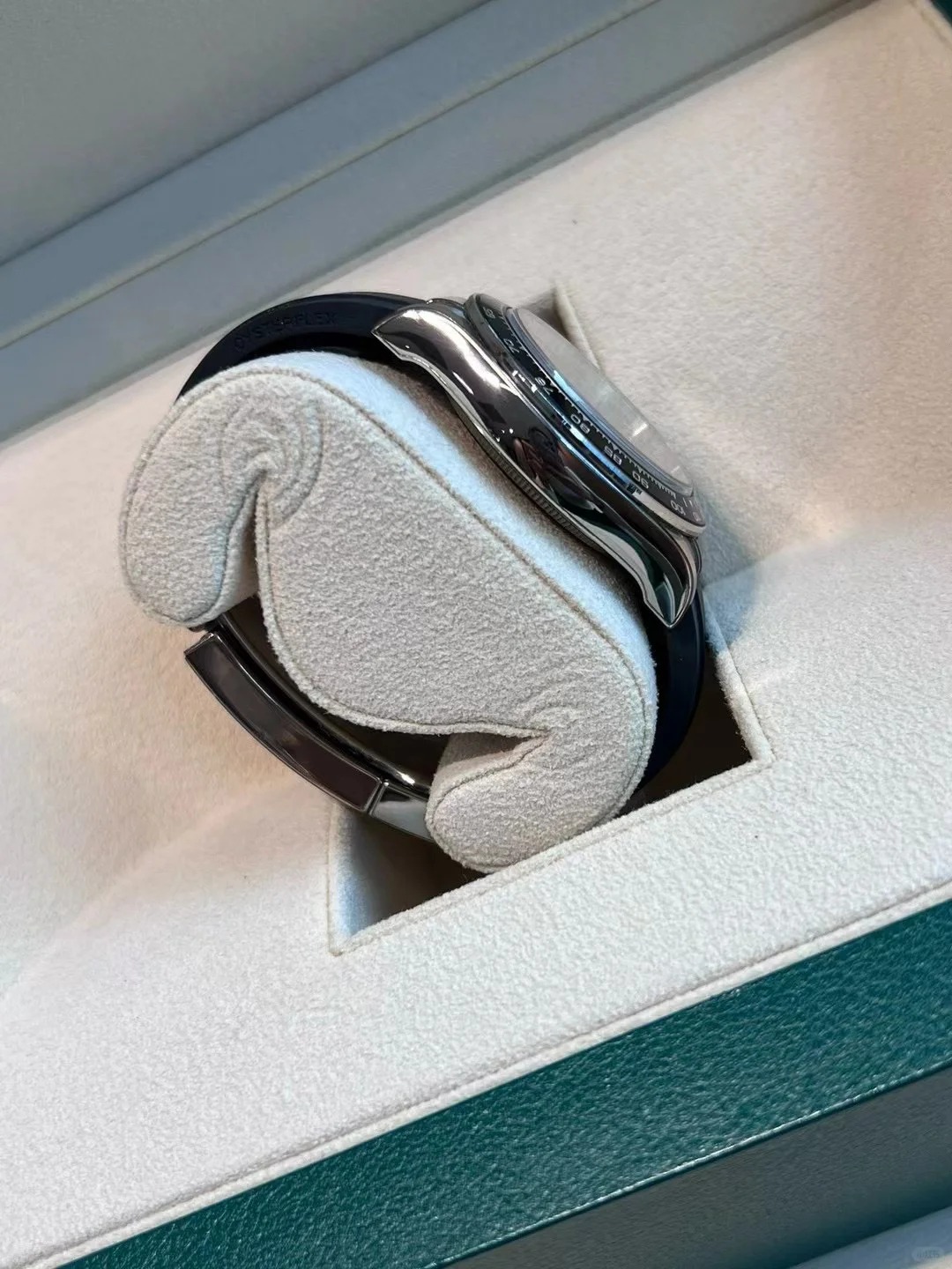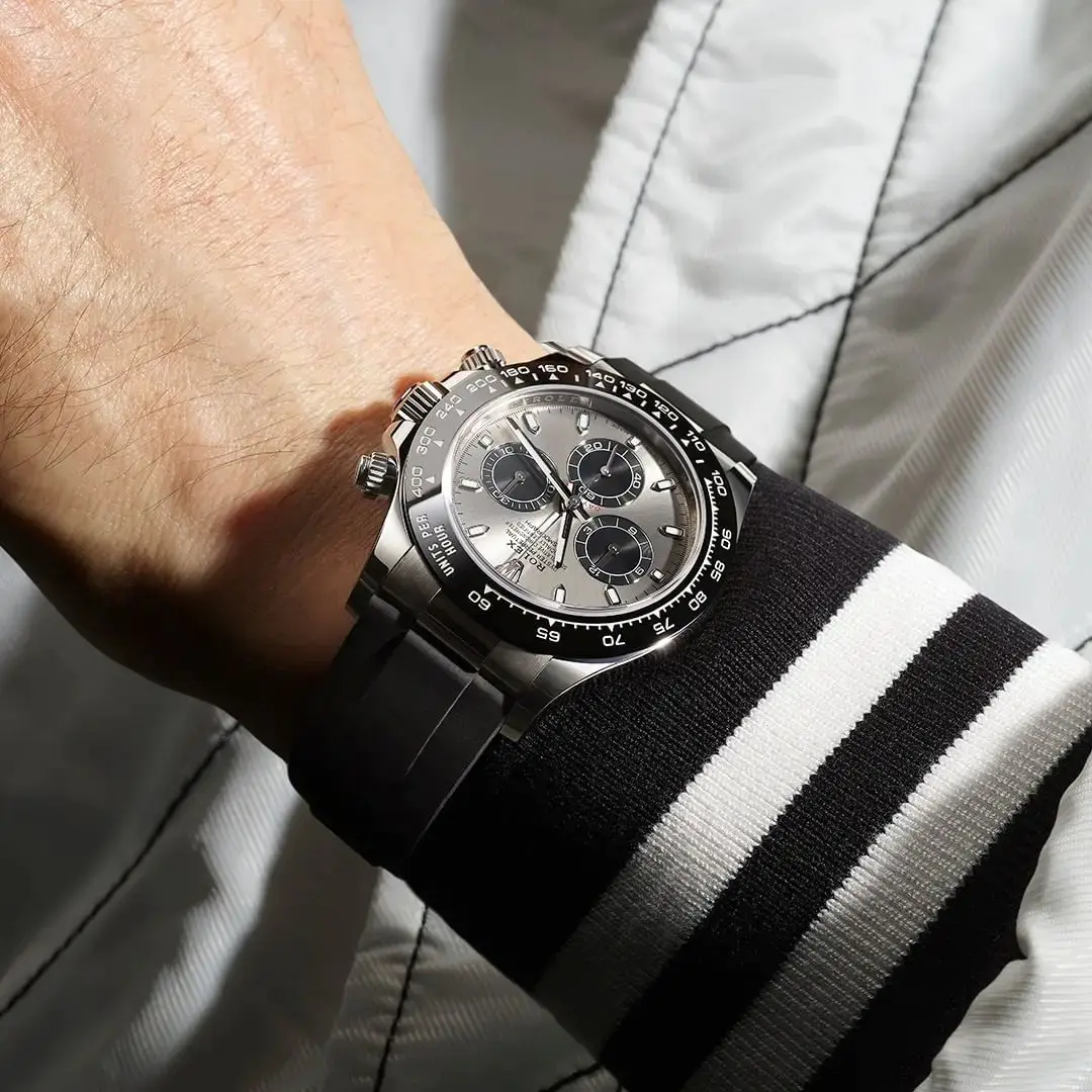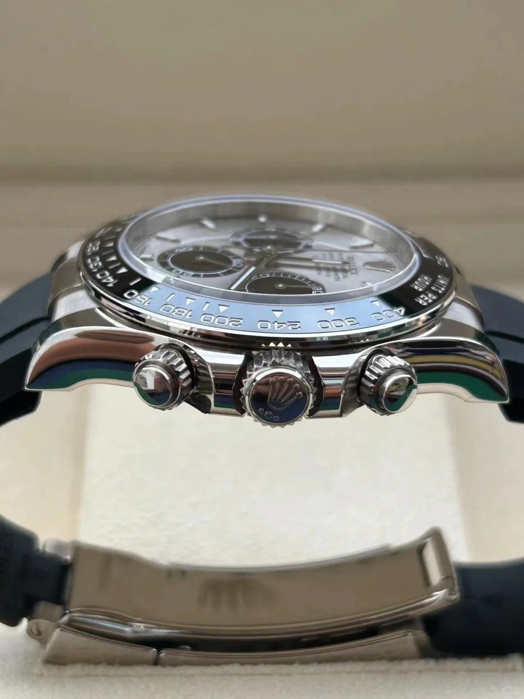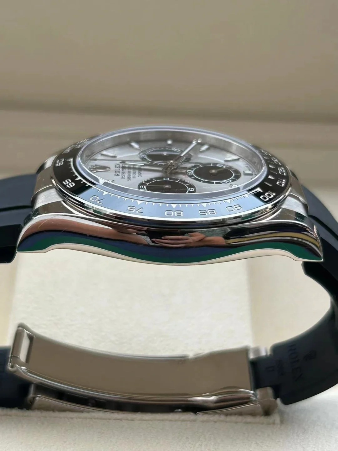 • The Oyster Perpetual Cosmograph Daytona in 18K white gold features a stainless steel and gloss black dial and an Oysterflex bracelet with a black Cerachrom bezel with a tachymeter. -m126519ln-0006 40mm