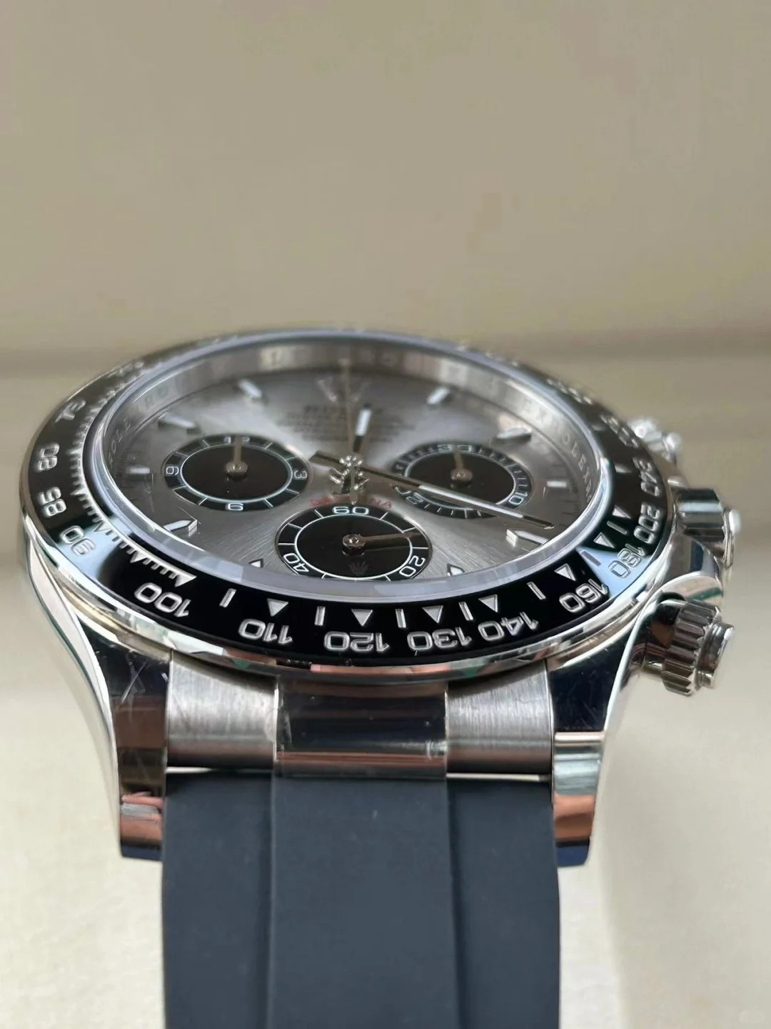 The Oyster Perpetual Cosmograph Daytona in 18K white gold features a stainless steel and gloss black dial and an Oysterflex bracelet with a black Cerachrom bezel with a tachymeter. -m126519ln-0006 40mm