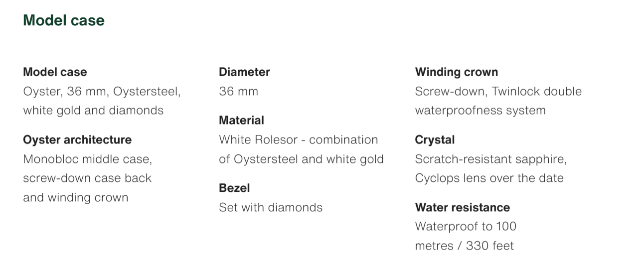 • The Oyster Perpetual Datejust 36 is available in white gold and Oystersteel with a diamond-set white mother-of-pearl dial and an Oyster bracelet. -m126284rbr-0012