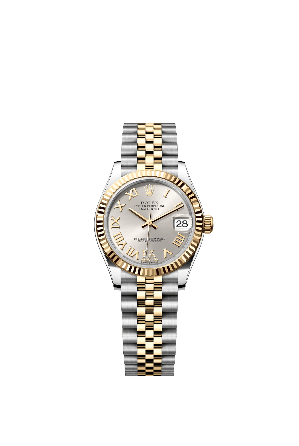 The Oyster Perpetual Datejust 31 is available in yellow gold and Oystersteel. with a silver-toned diamond-set dial and a Jubilee bracelet. -m278273-0004