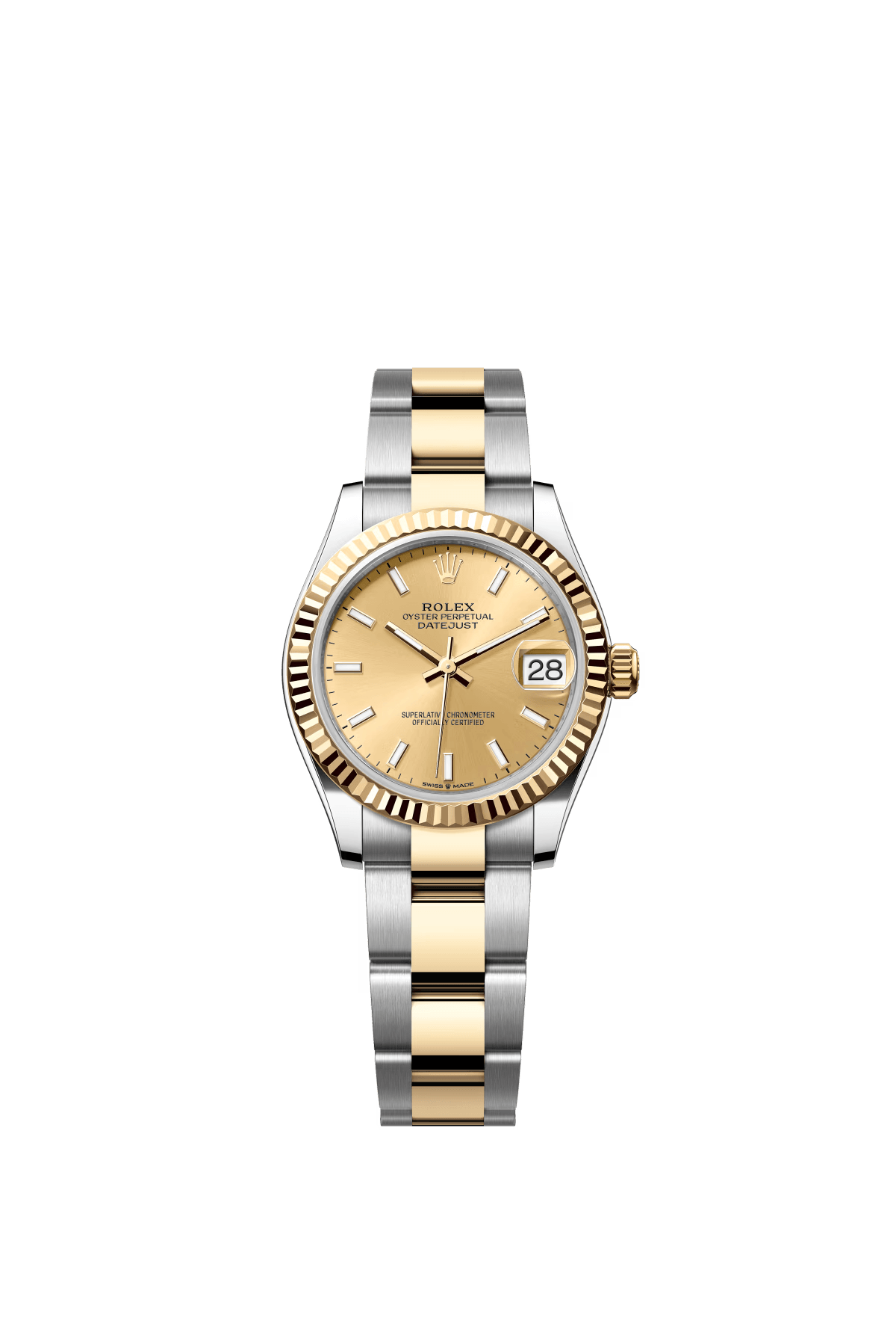 The Oyster Perpetual Datejust 31 is available in yellow gold and Oysteel. with a champagne-coloured dial and an Oyster bracelet. -m278273-0013