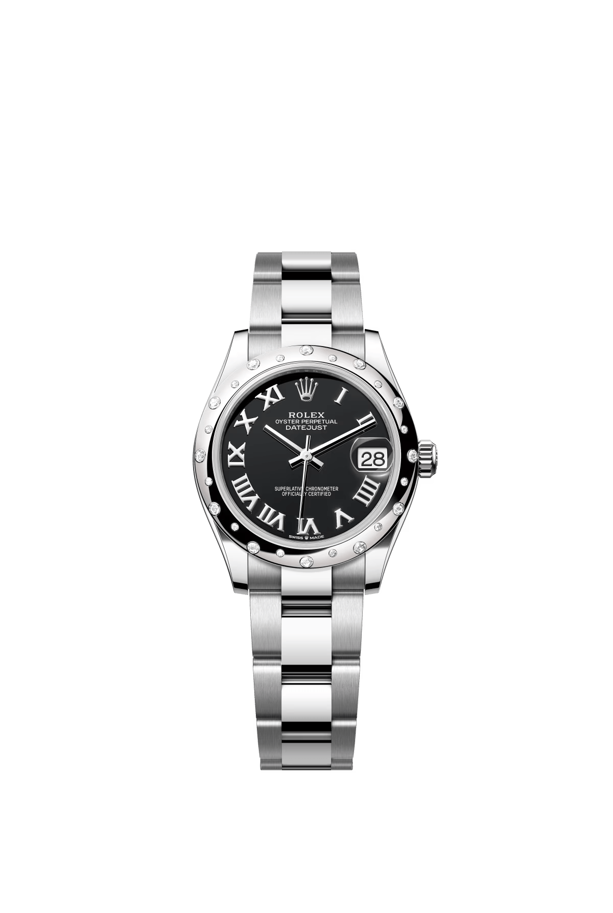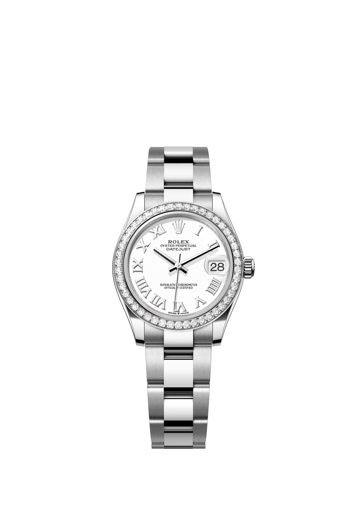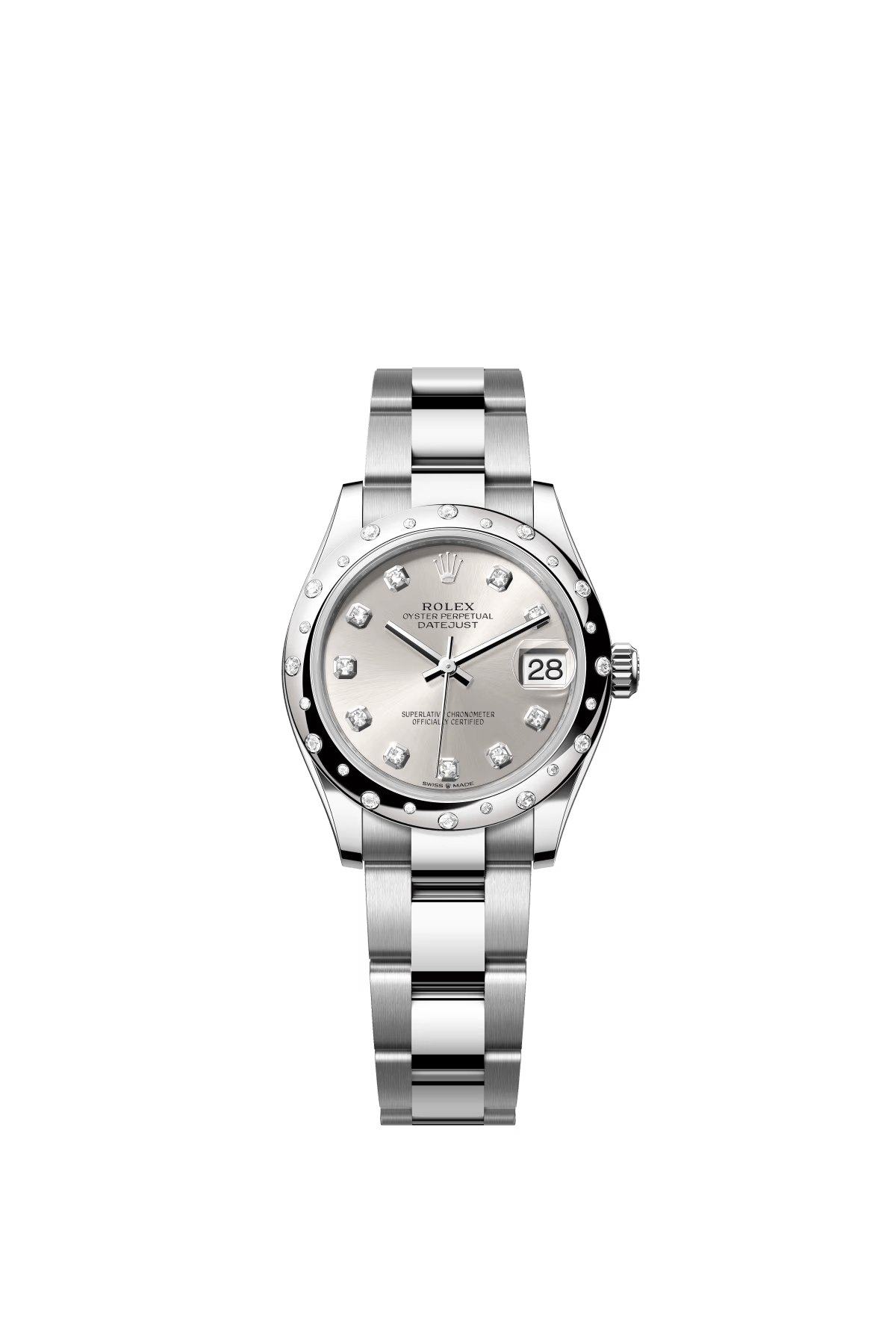 The Oyster Perpetual Datejust 31 is available in white gold and Oysteel. with a diamond-set silver dial and an Oyster bracelet. -m278344rbr-0031