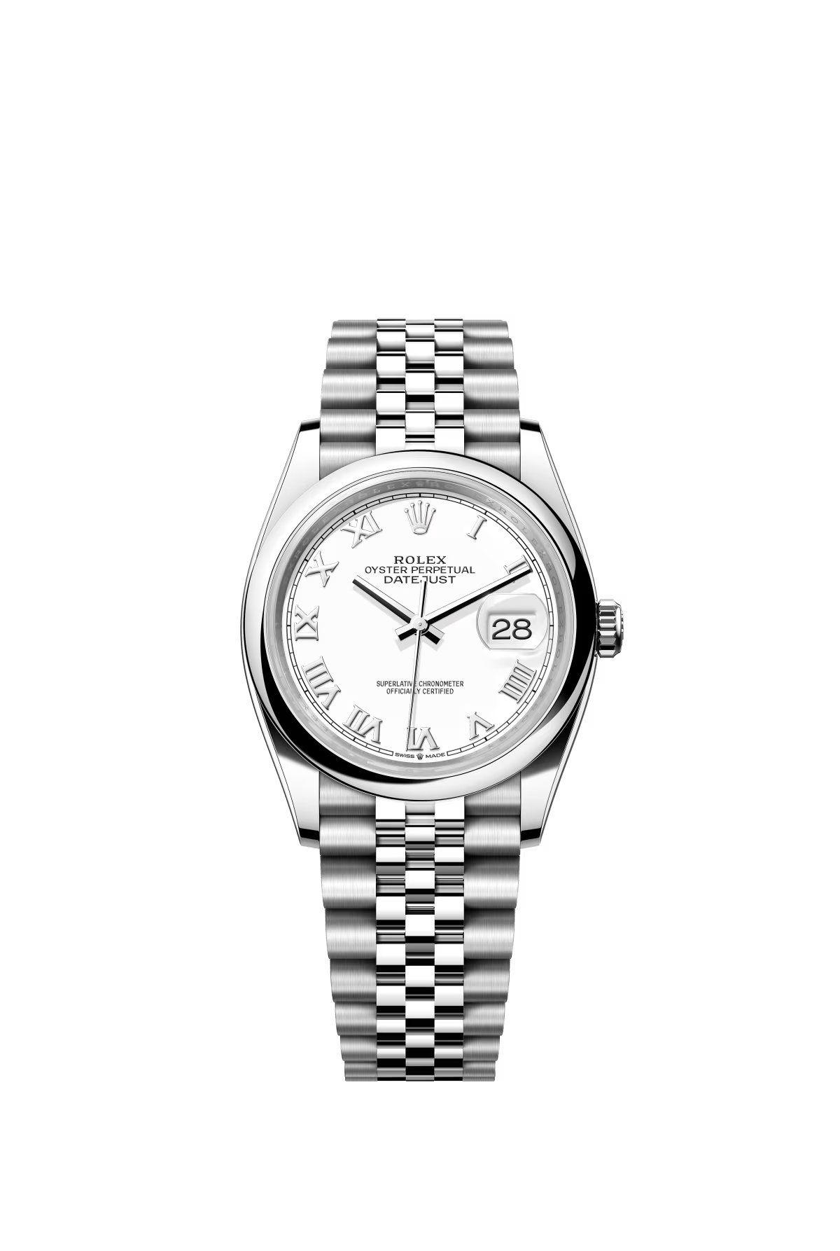 The Oyster Perpetual Datejust 36 is available in Oyster steel with a white dial and a Jubilee bracelet. -m126200-0007
