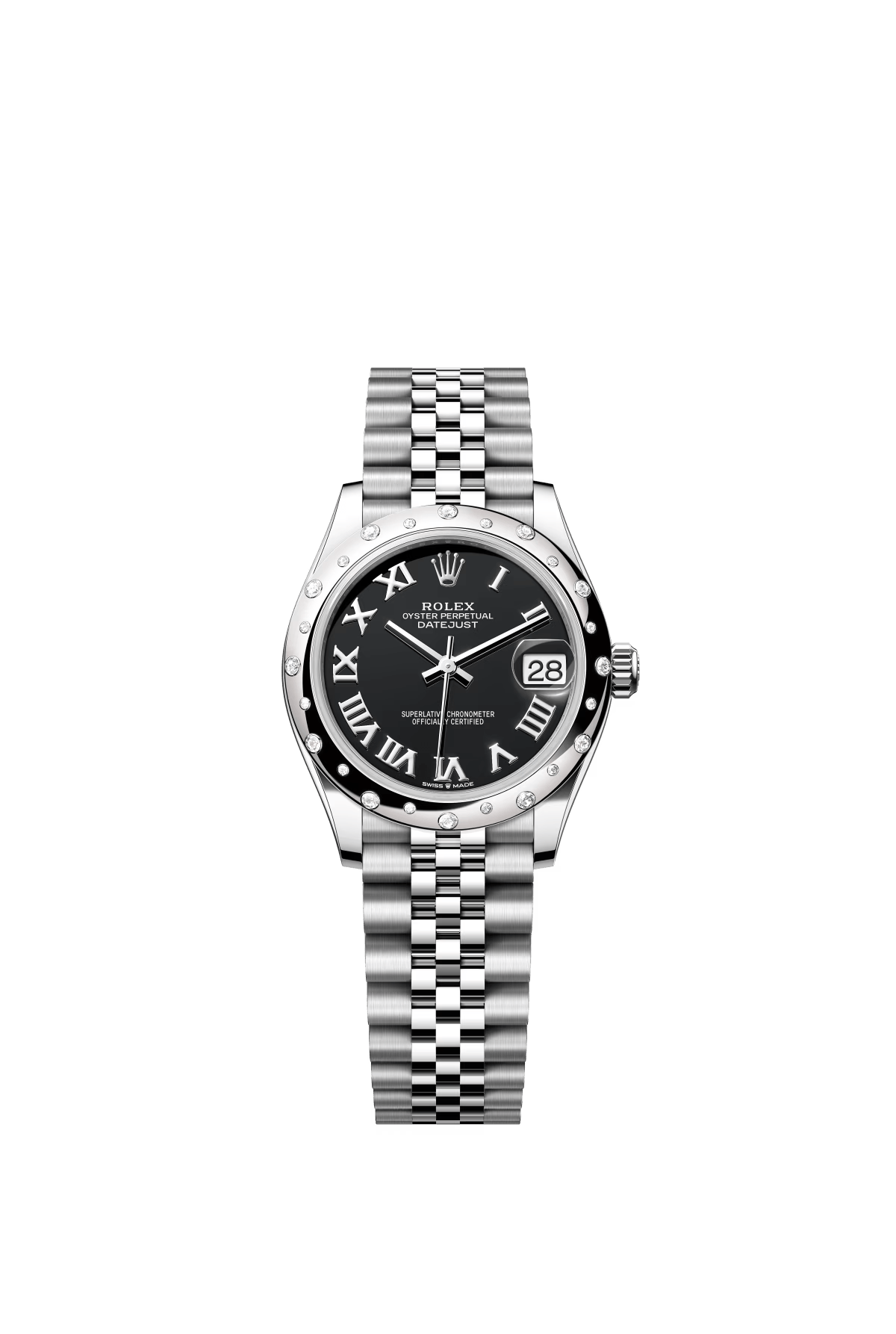 The Oyster Perpetual Datejust 31 is made of Oyster steel with a glossy black dial and a Jubilee bracelet. -m278240-0002