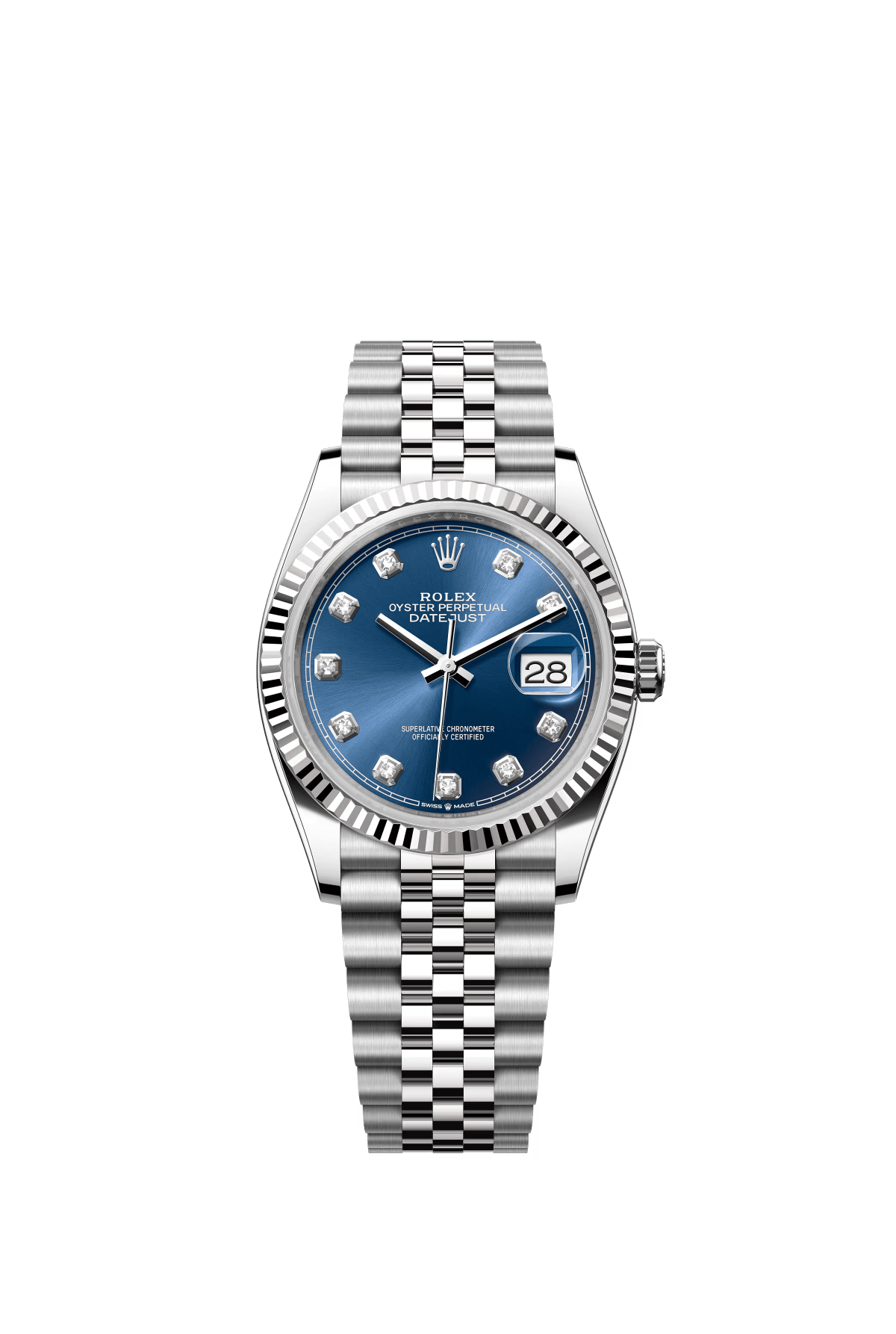 The Oyster Perpetual Datejust 36 is available in white gold and Oystersteel. with a brilliant blue diamond-set dial and a Jubilee bracelet. -m126234-0037
