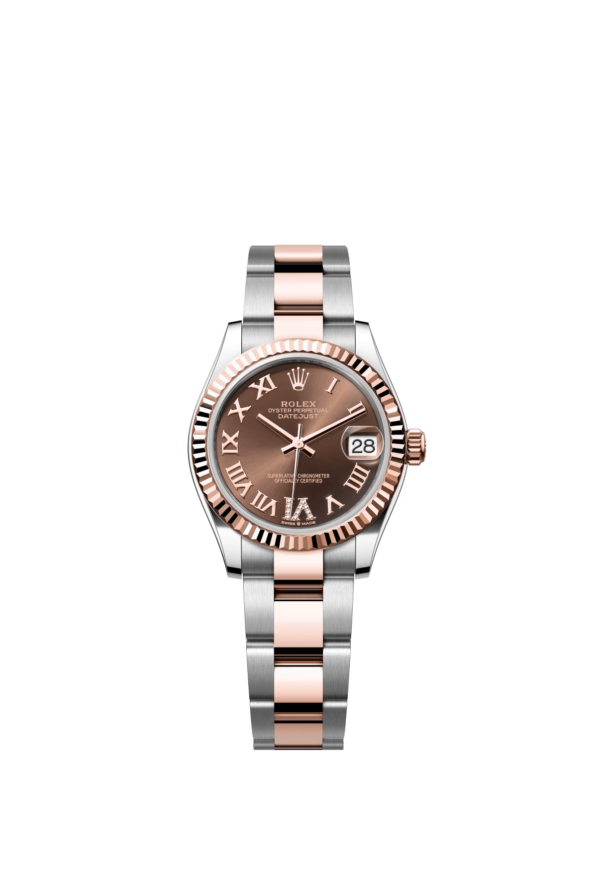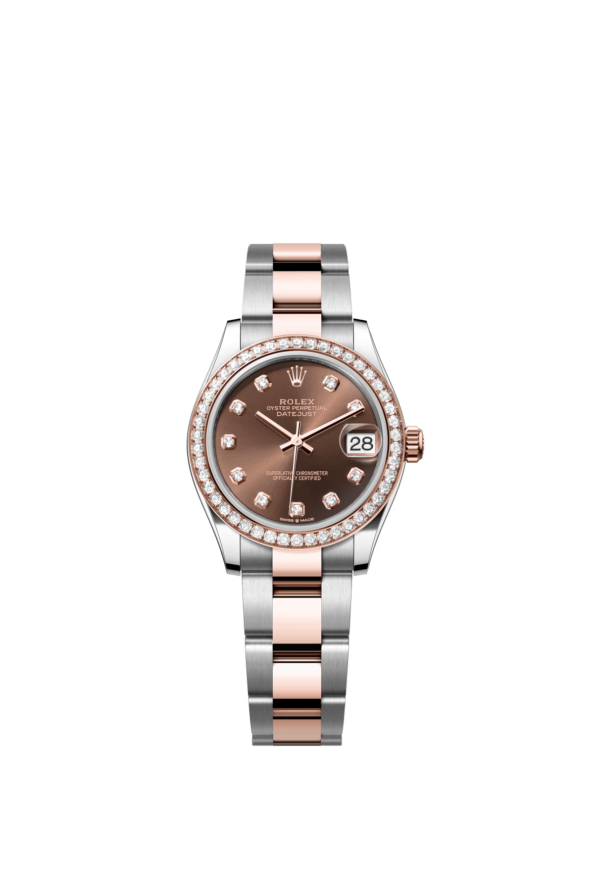The Oyster Perpetual Datejust 31 is available in Everose gold and Oystersteel with a chocolate-coloured diamond-set dial and an Oyster bracelet. -m278381rbr-0027