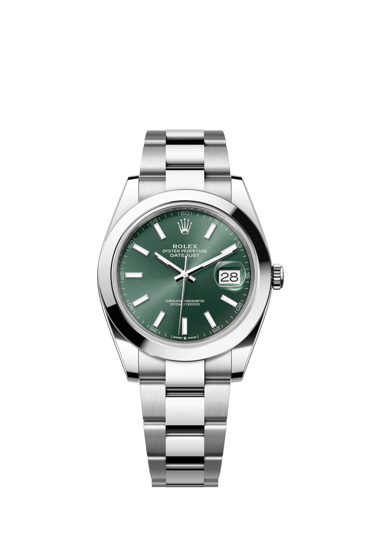 The Oyster Perpetual Datejust 41 is available in Oysteel with a mint green dial and an Oyster bracelet. -m126300-0019