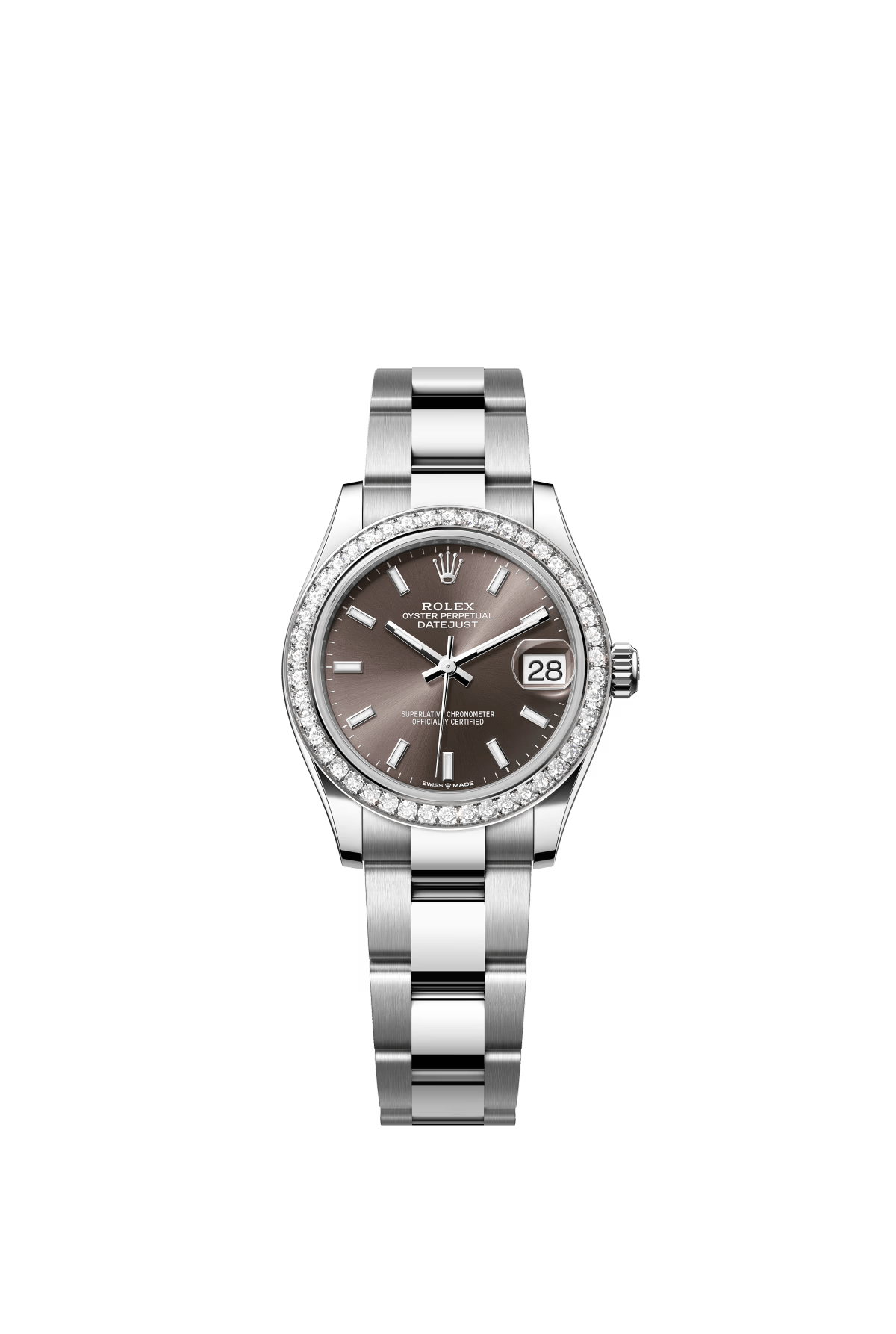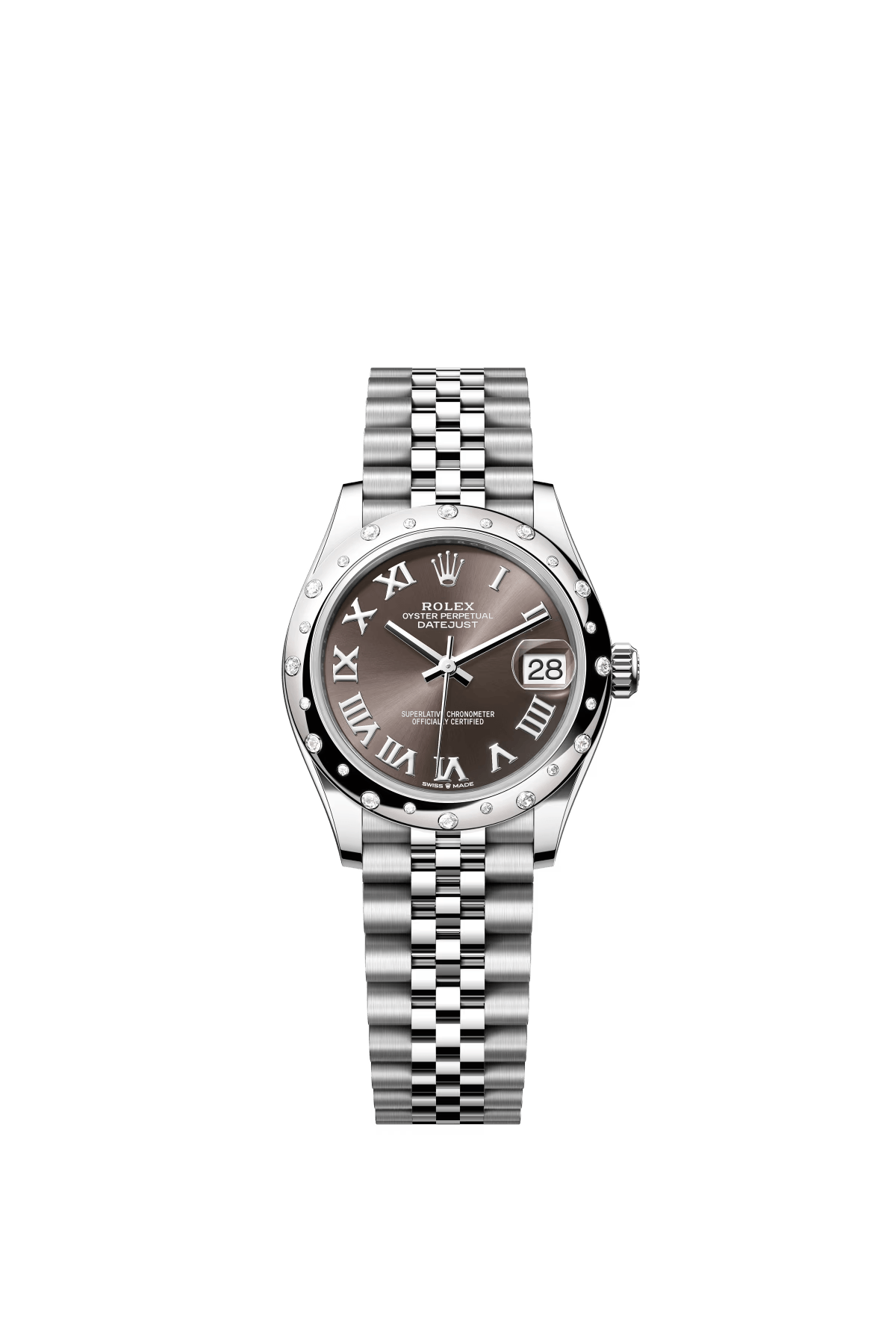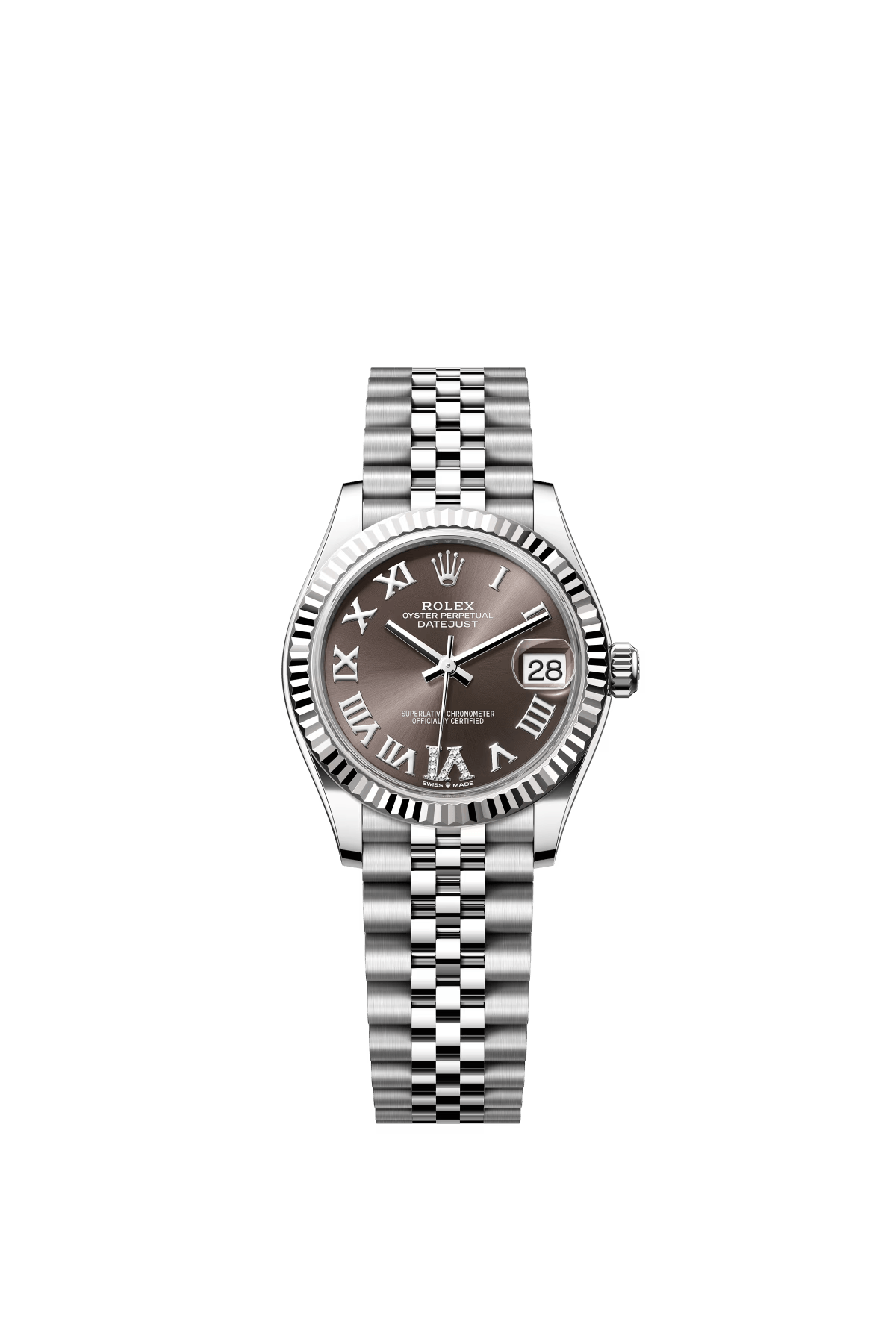 The Oyster Perpetual Datejust 31 is available in white gold and Oystersteel with a diamond-set dark grey dial and a Jubilee bracelet. -m278274-0028