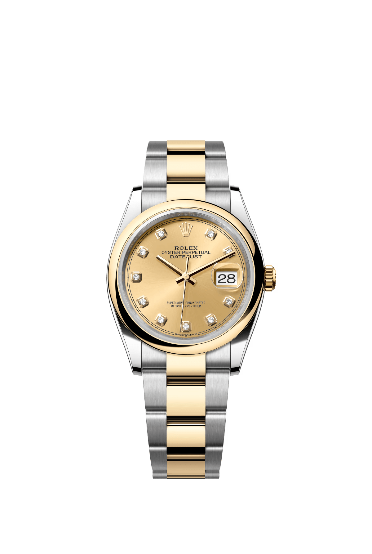 The Oyster Perpetual Datejust 36 in yellow gold and Oysteel with a diamond-set champagne dial and an Oyster bracelet. -m126203-0018
