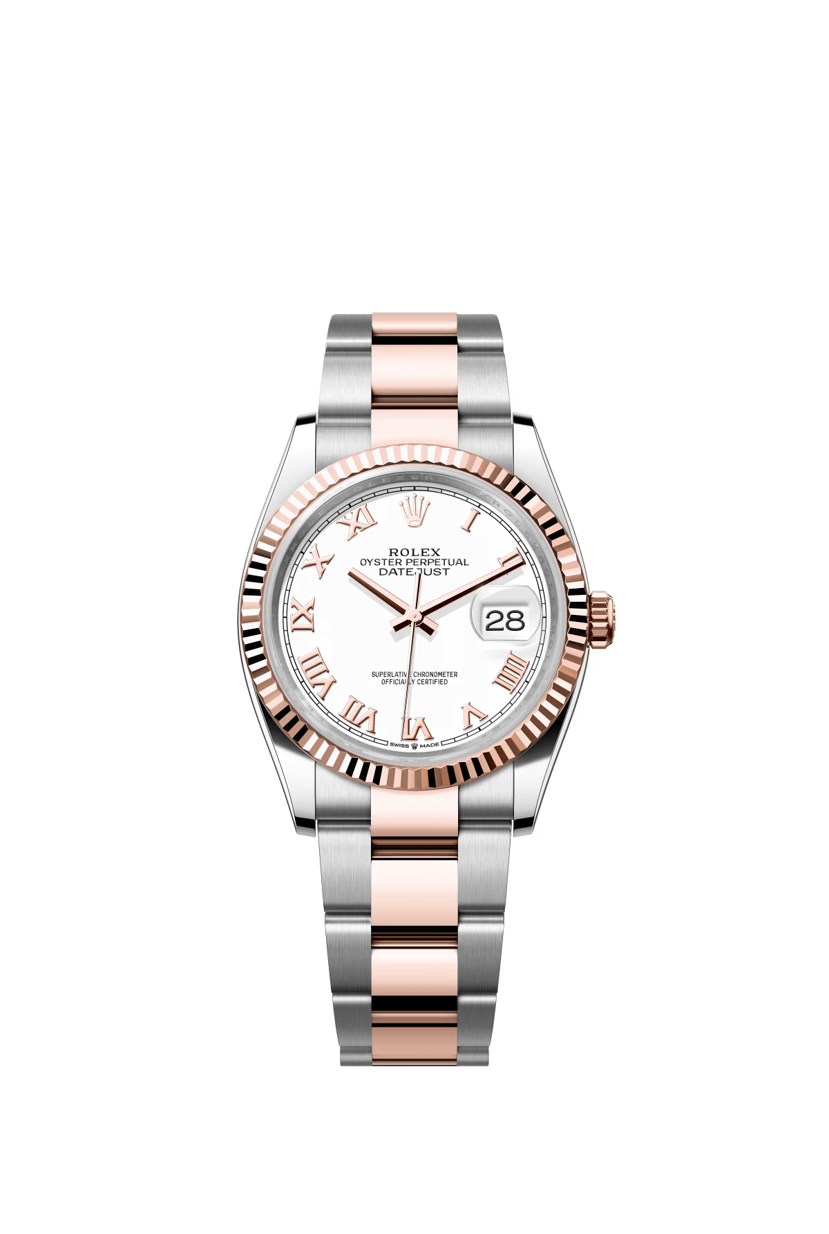 The Oyster Perpetual Datejust 36 is available in Everose gold and Oystersteel. with a white dial and an Oyster bracelet. -m126231-0016