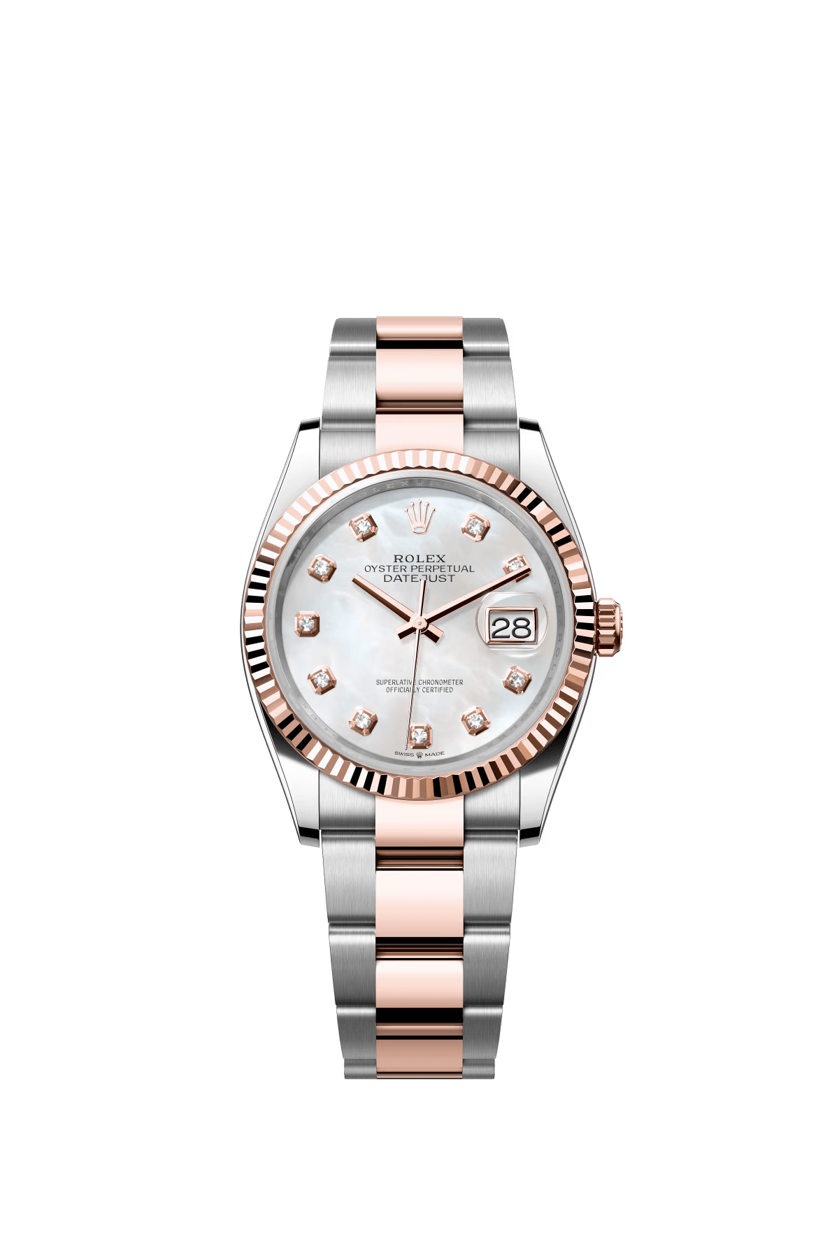 The Oyster Perpetual Datejust 36 is available in Everose gold and Oystersteel. with a diamond-set white mother-of-pearl dial and an Oyster bracelet. -m126231-0022