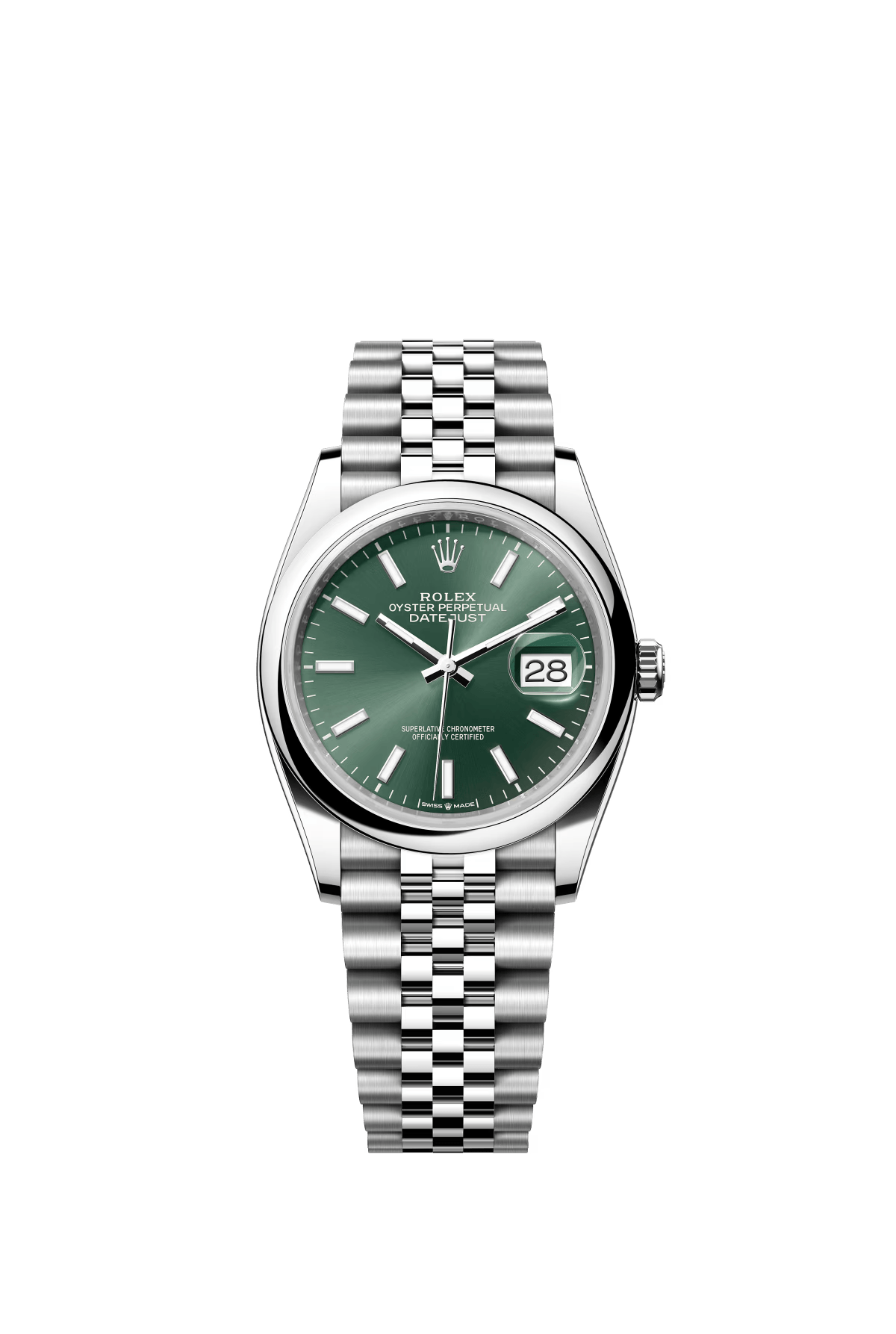 The Oyster Perpetual Datejust 36 is available in Oyster steel with a mint green dial and a Jubilee bracelet. -m126200-0023