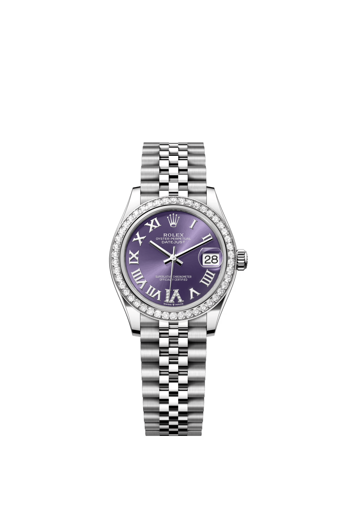 The Oyster Perpetual Datejust 31 is available in white gold and Oystersteel with a diamond-set eggplant purple dial and a Jubilee bracelet. -m278384rbr-0030